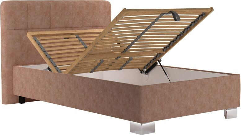 Moderní postel s čelem 90 x 200 cm se dodává s volně loženou sendvičovou matrací NELLY uloženou na polohovacím lamelovém roštu ( polohování hlava + nohy, 28 lamel, nastavení tuhosti, popruh proti přetížení ). Úložný prostor je přístupný od nohou. Otevírání úložného prostoru pomocí plynových pístů. Potahová látka - Aragon 62.