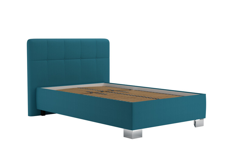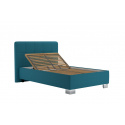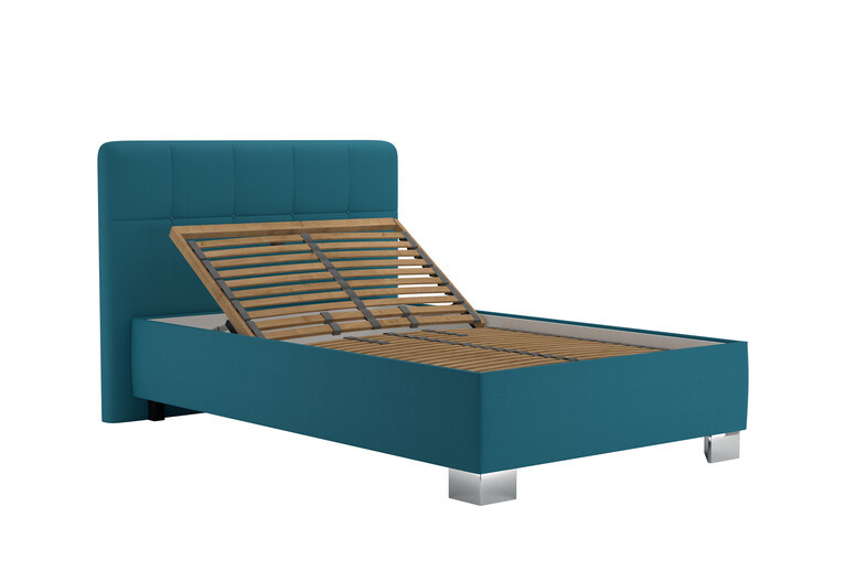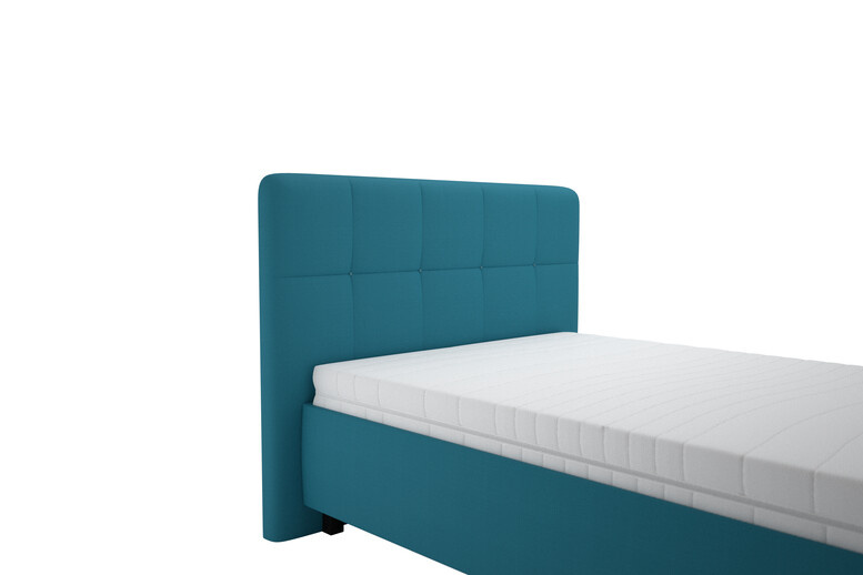 Moderní postel 90x200 cm se dodává bez matrace nebo s volně loženou sendvičovou matrací NELLY uloženou na polohovacím lamelovém roštu ( polohování hlava + nohy, 28 lamel, nastavení tuhosti, popruh proti přetížení ). Úložný prostor je přístupný od nohou. Otevírání úložného prostoru pomocí plynových pístů. Potahová látka - ENJOY 17 - turkis.