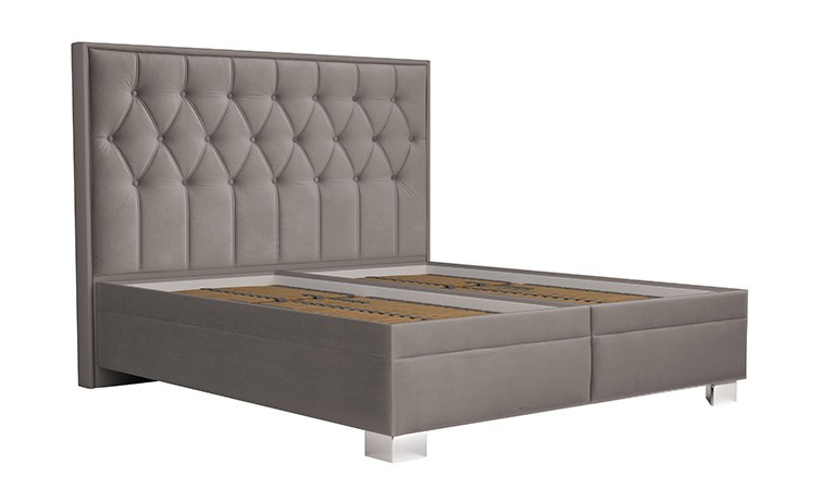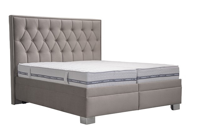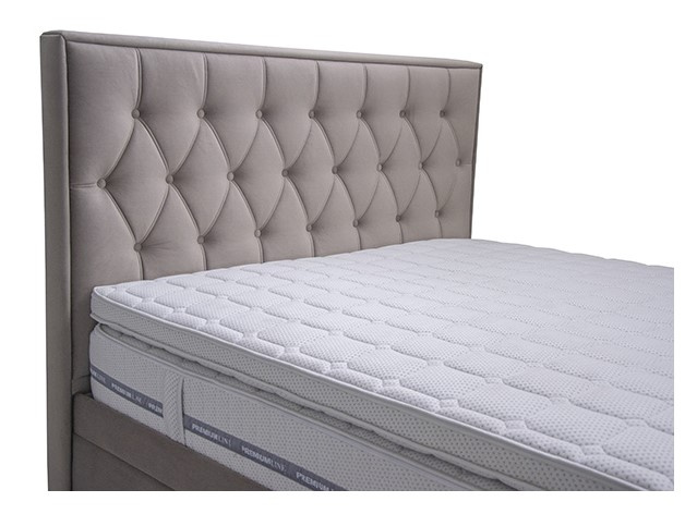 Luxusní dvoulůžko KERSTIN s vynikajícími ortopedickými vlastnostmi a mimořádnou výškou lehací plochy s vysokým prošívaným čelem. V akční nabídce je postel Kerstin v potahové látce RIVIERA 16 - hnědá.