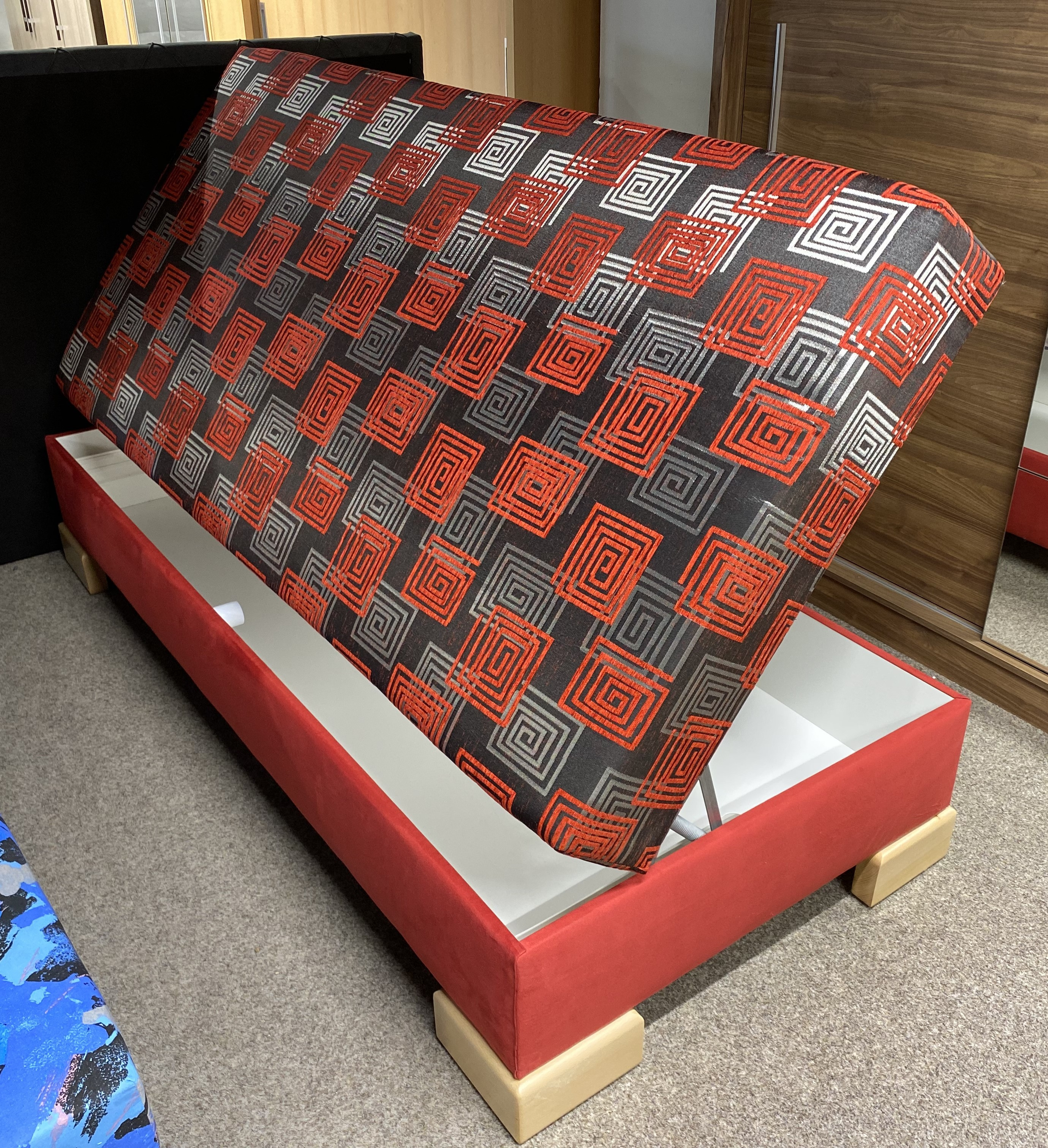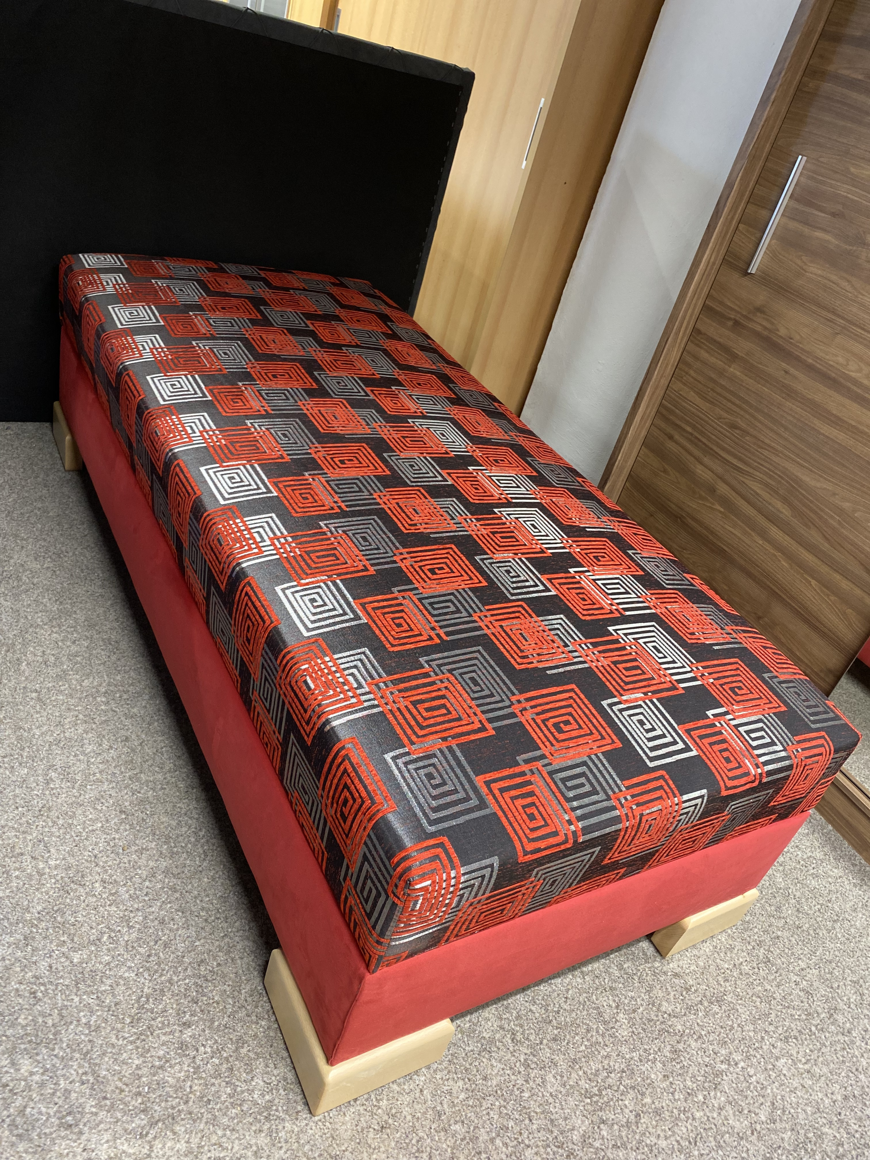 Moderní designová postel NOVO s krátkým čelem. S pevným lamelovým roštem, pružinovou matrací s vyšší pevností a tvarovou stálostí. Velký úložný prostor v bílém laminu s odvětrávacími otvory. Přístup do úložného prostoru je z boku postele. Lehací plocha postele je 80x200 cm nebo 90x200 cm. Pružinová matrace zajišťuje dokonalý odpočinek a dobrou kvalitu spánku. Nožky postele můžete volit podle tvaru Noha 1 a 2 je 6 cm vysoká a noha 3, 4, 5 a 6 je vysoká 12cm.