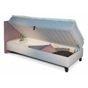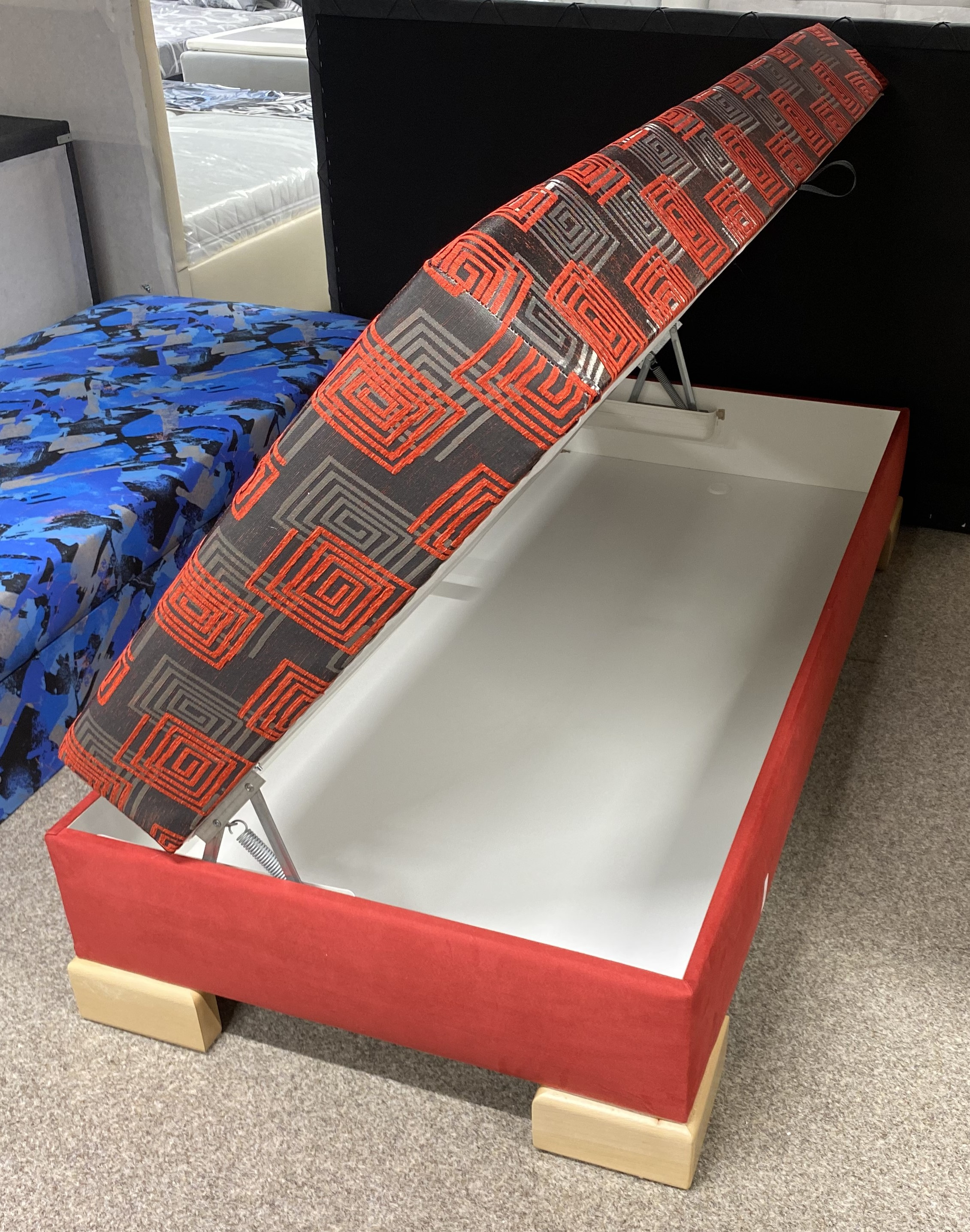 Moderní designová postel NOVO. S pevným lamelovým roštem, pružinovou matrací s vyšší pevností a tvarovou stálostí. Velký úložný prostor v bílém laminu s odvětrávacími otvory. Přístup do úložného prostoru je z boku postele. Lehací plocha postele je 80x200 cm nebo 90x200 cm. Pružinová matrace zajišťuje dokonalý odpočinek a dobrou kvalitu spánku. Nožky postele můžete volit podle tvaru Noha 0, 1 a 2 je 6 cm vysoká a noha 3, 4, 5 a 6 je vysoká 12cm.