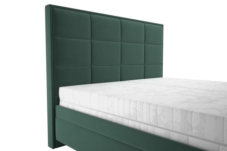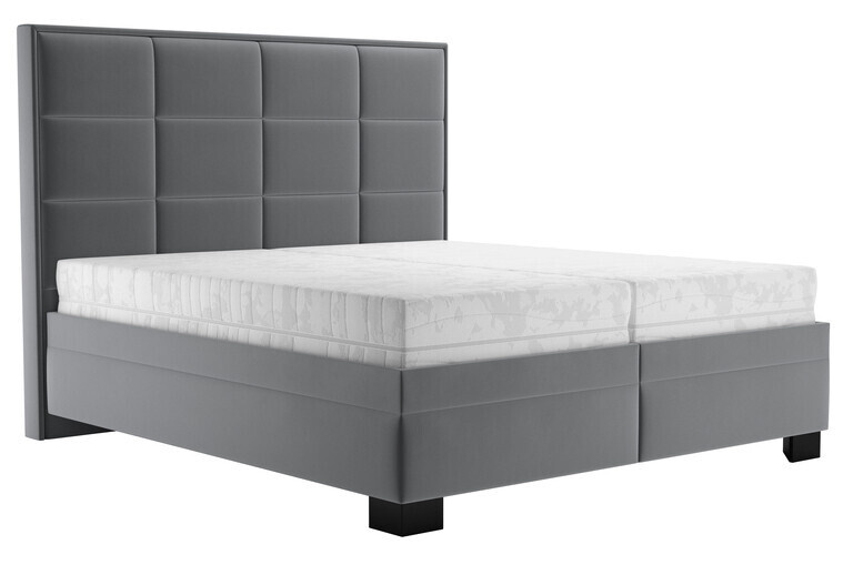 Luxusní dvoulůžko SABRINA s vynikajícími ortopedickými vlastnostmi s mimořádnou výškou lehací plochy s vysokým prošívaným čelem. Základem postele je kvalitní 28 lamelový rošt s mechanickým polohováním hlavy s nastavením tuhosti lamel a s popruhem proti přetížení, kvalitní sedmi zónová matrace IVANA de luxe a velký výběr potahových látek.