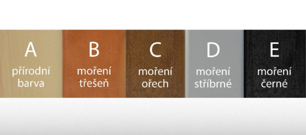 Nožičky postele si můžete zvolit: A-přírodní, B-třešeň, C-ořech, D-stříbrná, E-černá