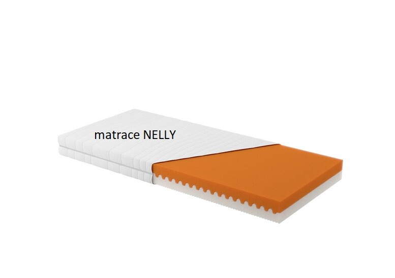 Matrace NELLY plus z kvalitních pěn, která je díky speciálnímu zámkovému systému vyrobená bez použití lepidel. Jádro je složeno z desek z polyuretanových pěn o nižší (žlutá pěna) a vyšší (růžová pěna) tuhosti, což umožňuje výběr měkčí a tvrdší strany matrace. Komfort lehací plochy měkčí strany je zvýšen tvarovým prořezem, který zajišťuje lepší odvětrávání povrchu matrace. Velká výška matracového jádra zajišťuje zvýšený lehací komfort těla uživatele. Matrace je opatřena snímatelným, pratelným potahem. Výška matrace v potahu je cca 21 cm. Matrace je opatřena snímatelným a pratelným potahem. Doporučená nosnost do 110 kg