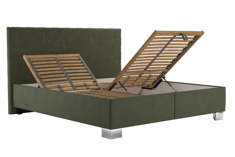 Základem postele je kvalitní polohovací lamelový rošt s přístupen do úložného prostoru od nohou, s nastavením tuhosti lamel a s popruhem proti přetížení s matrací NELLY plus.