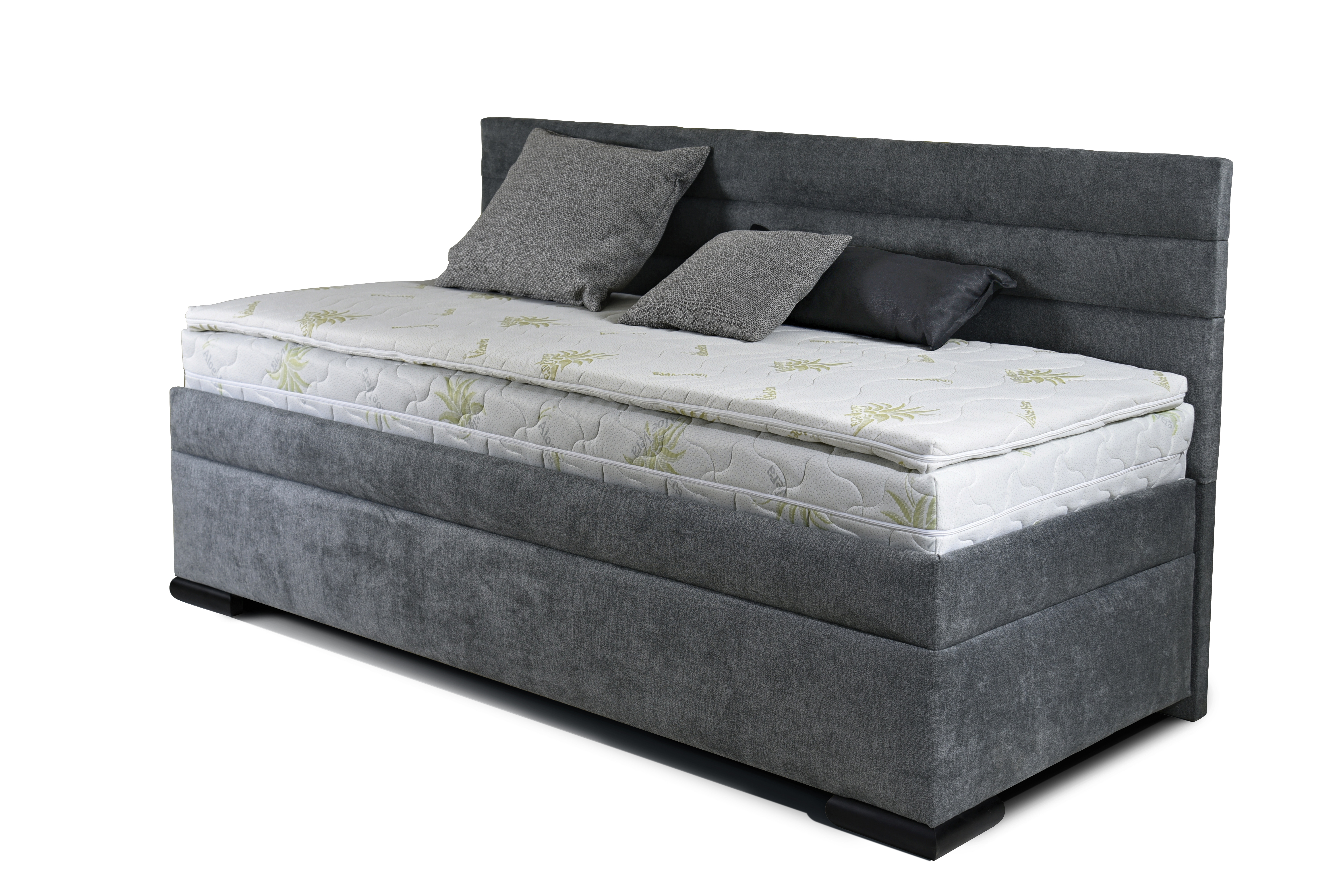 Postel VENETO s dlouhým čelem je z nové modelové řady PREMIUM BOXSPRING. Tato řada kontinentálních postelí nabízí maximální komfort a relaxaci. Tyto postele jsou vysoké a mají důmyslný systém odvětrávání. Múžete si vybrat postel s úložným prostorem přístupným od nohou s možností polohování a z boku postele v případě nepolohovacích roštů. Vzdušné pružinové jádro, textilie, pěna a duté vlákno jsou pevně začalouněné k lamelovému masivnímu rámu. Úložný prostor dostatečné velikosti s odvětráváním zajišťuje přívod vzduchu k matracím. Vynikající doplněk pro každý typ matrace je TOPPER. Je vhodný k ochraně matrace a komfortu spánku. Můžete si sami vybrat rošt a matraci. Toto jednolůžko má lehací plochu 80 × 200 cm, 90 x 200 cm nebo 100 x 200 cm Maximálně pohodlná a praktická postel s komfortní výškou lehací plochy podle zvolené matrace 59-70 cm. Pro postel si můžete zvolit rošt mechanicky polohovatelný, přístup do úložného prostoru od nohou postele. Nebo rošt nepolohovatelný, určený pro boční přístup k úložnému prostoru. Oba typy mají plynové písty ( umožní snadný přístup k úložnému prostoru ).