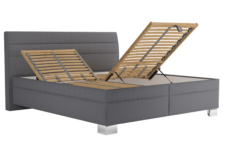 Základem postele je kvalitní polohovací lamelový rošt s přístupen do úložného prostoru od nohou, s nastavením tuhosti lamel a s popruhem proti přetížení. Objednat si můžete postel s matrací ASTERIA