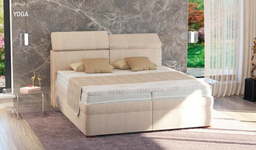 Postel YOGA je z nové modelové řady PREMIUM BOXSPRING. Tato řada kontinentálních postelí nabízí maximální komfort a relaxaci. Postele typu BOXSPRING jsou známy především z luxusních hotelů. Individuální zpracování a konstrukční kvalita řadí tyto postele do kategorie PREMIUM. Tyto postele jsou vysoké a mají důmyslný systém odvětrávání . Můžete si zvolit postel bez úložného prostoru nebo s úložným prostorem, který je přístupný od nohou s možností polohování a z boku postele v případě nepolohovacích roštů. K posteli doporučujeme matraci CONTINENTAL. Okraj postele převyšuje základní Boxspring a zabraňuje takzvanému skluzu matrace. Duté vlákno a potahová látka změkčuje rám postele. Vzdušné pružinové jádro, textilie, pěna a duté vlákno jsou pevně přičalouněny k lamelovému masivnímu rámu. Úložný prostor dostatečné velikosti s odvětráváním zajišťuje přívod vzduchu k matracím. Vynikající doplněk pro každý typ matrace je TOPPER. Je vhodný k ochraně matrace a komfortu spánku. Můžete si sami vybrat rošt a matraci, které lze po několikaletém používání vyměnit, což představuje ekonomický, komfortní a hygienický přístup užívání postelí. Toto dvoulůžko má lehací plochu 180 × 200 cm nebo 160 x 200 cm. Maximálně pohodlná a praktická postel s komfortní výškou lehací plochy podle zvolené matrace 59-70 cm. Pro postel si můžete zvolit rošt mechanicky polohovatelný, přístup do úložného prostoru od nohou postele. Nebo rošt nepolohovatelný, určený pro boční přístup k úložnému prostoru. Oba typy mají plynové písty ( umožní snadný přístup k úložnému prostoru ). Max. zatížení 140 kg.