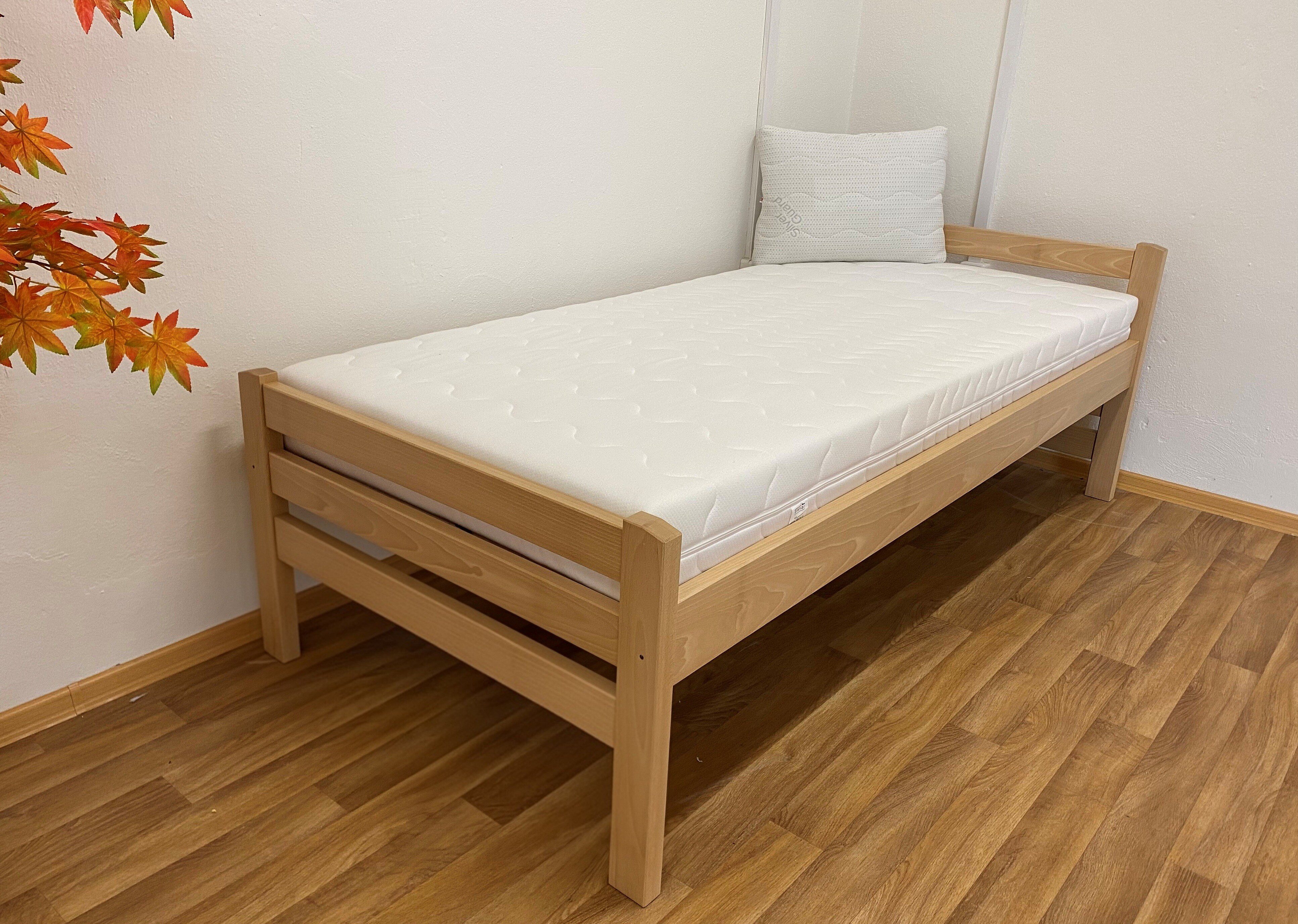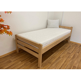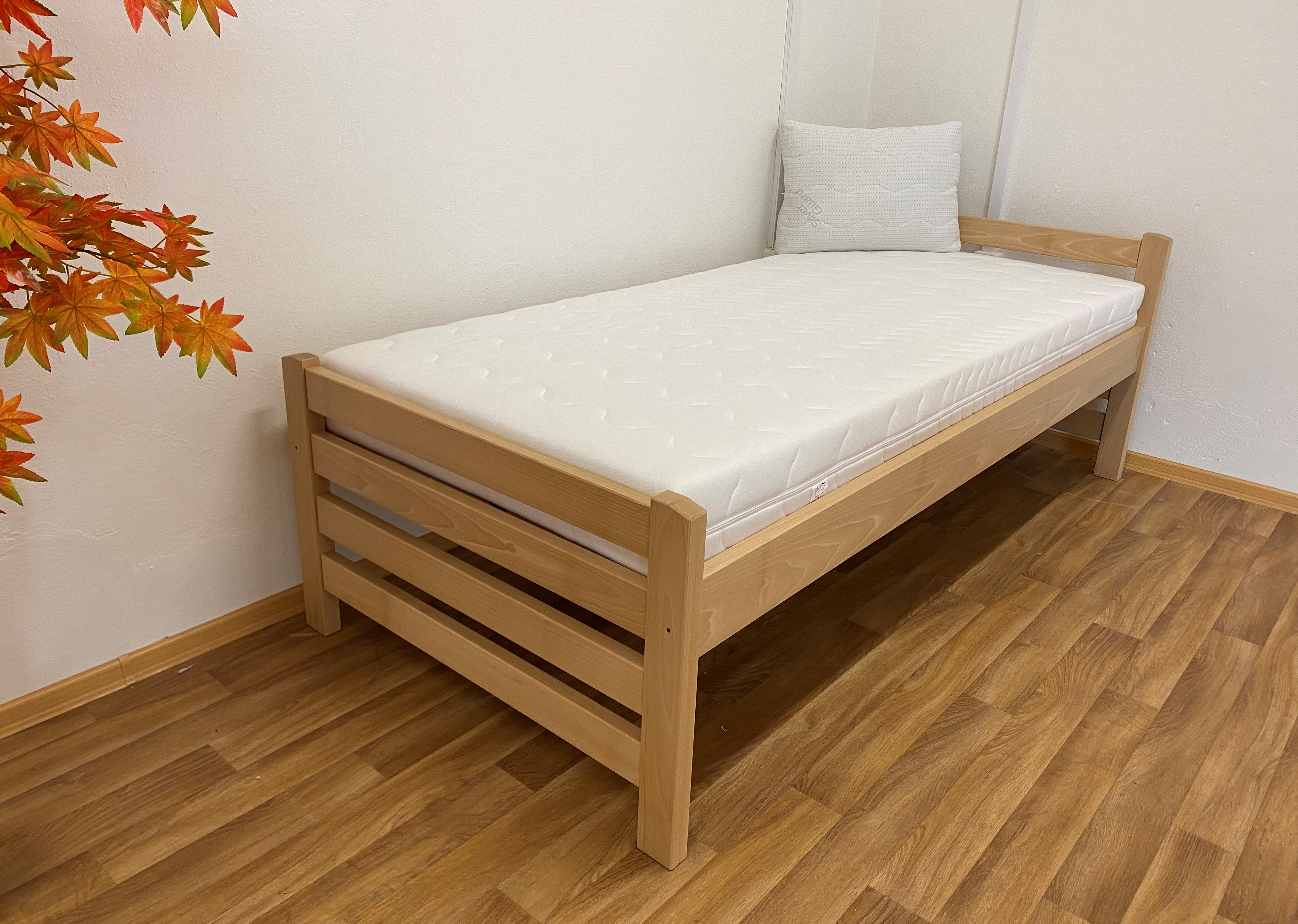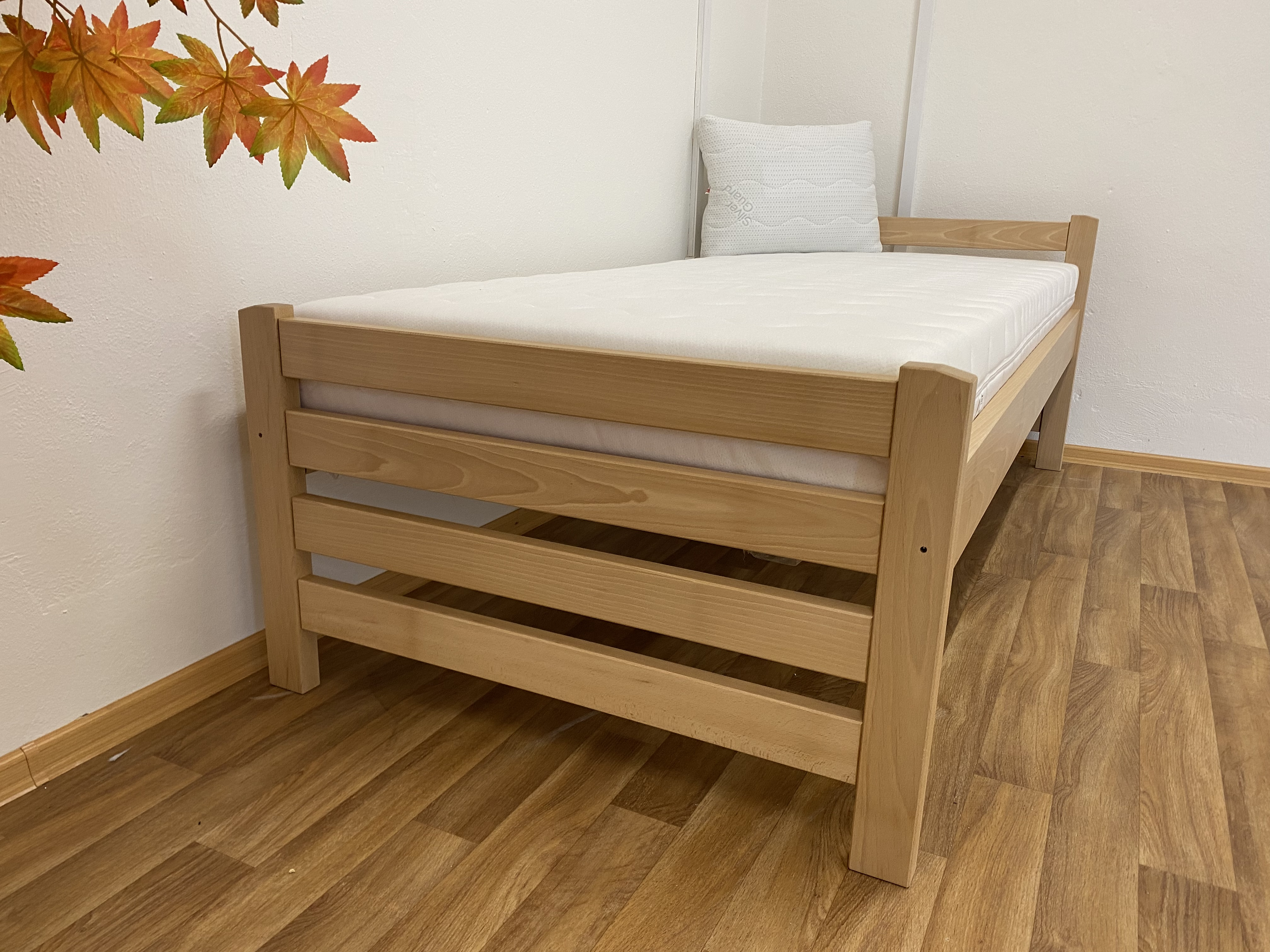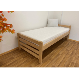 Masivní postel 90x200 cm. Postel je vyrobená z bukového masivu. Dřevěná konstrukce postele je povrchově upravena lakem s odolnou tvrdostí proti poškrábání. Rozměr lehací plochy je 90 x 200 cm. Nosnost do 120 Kg. Matrace a rošt není součástí postele, můžete si je objednat z naší nabídky. Postel je vyrobena z masivu o síle 3 cm. Tato síla masivu, zajišťuje dostatečnou pevnost a stabilitu.
