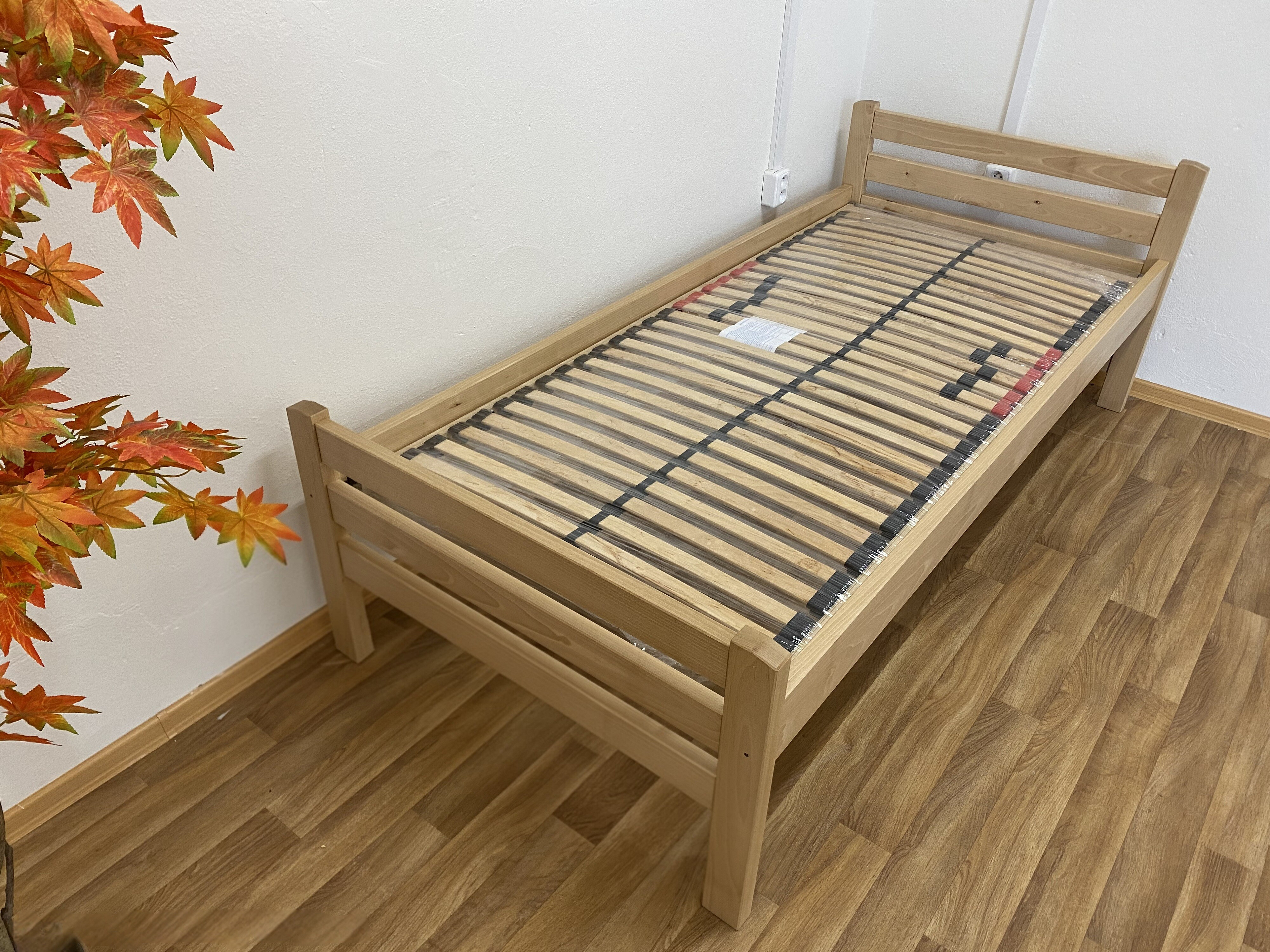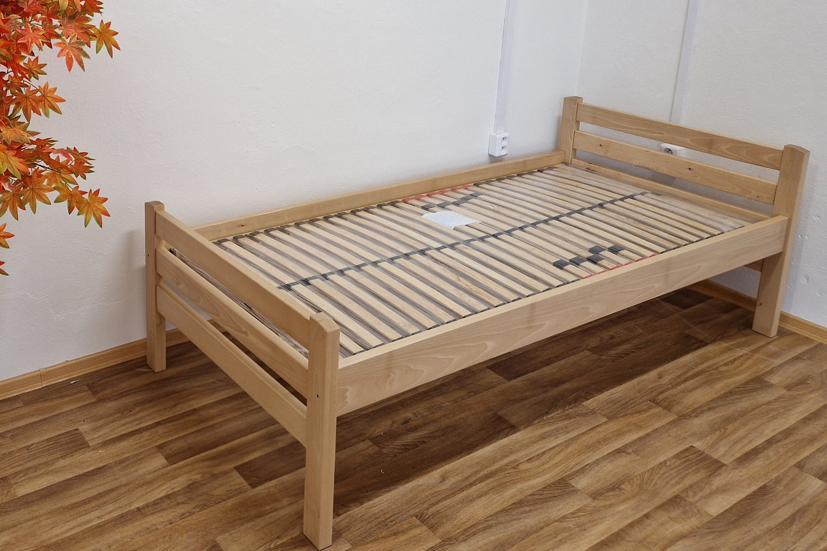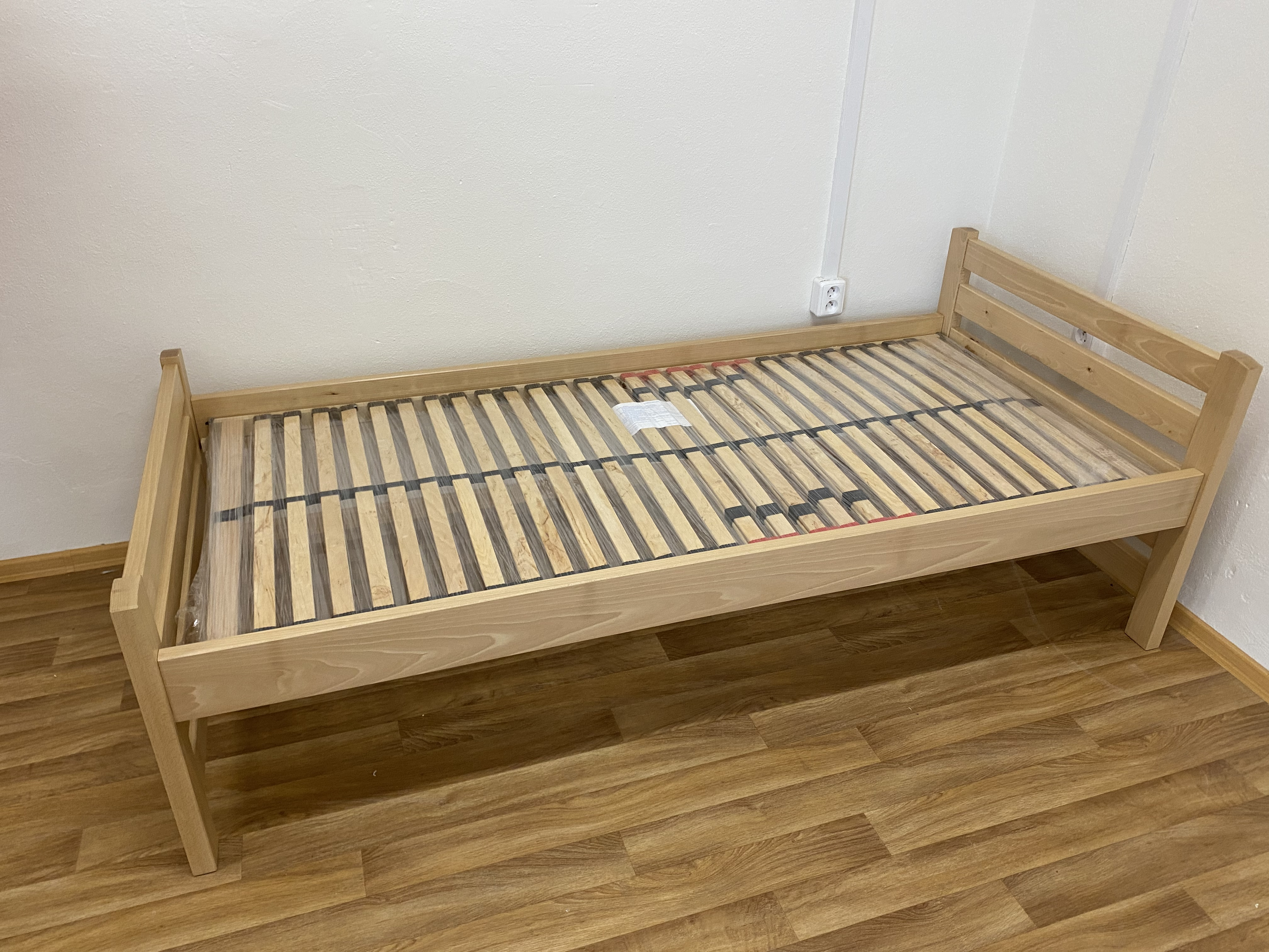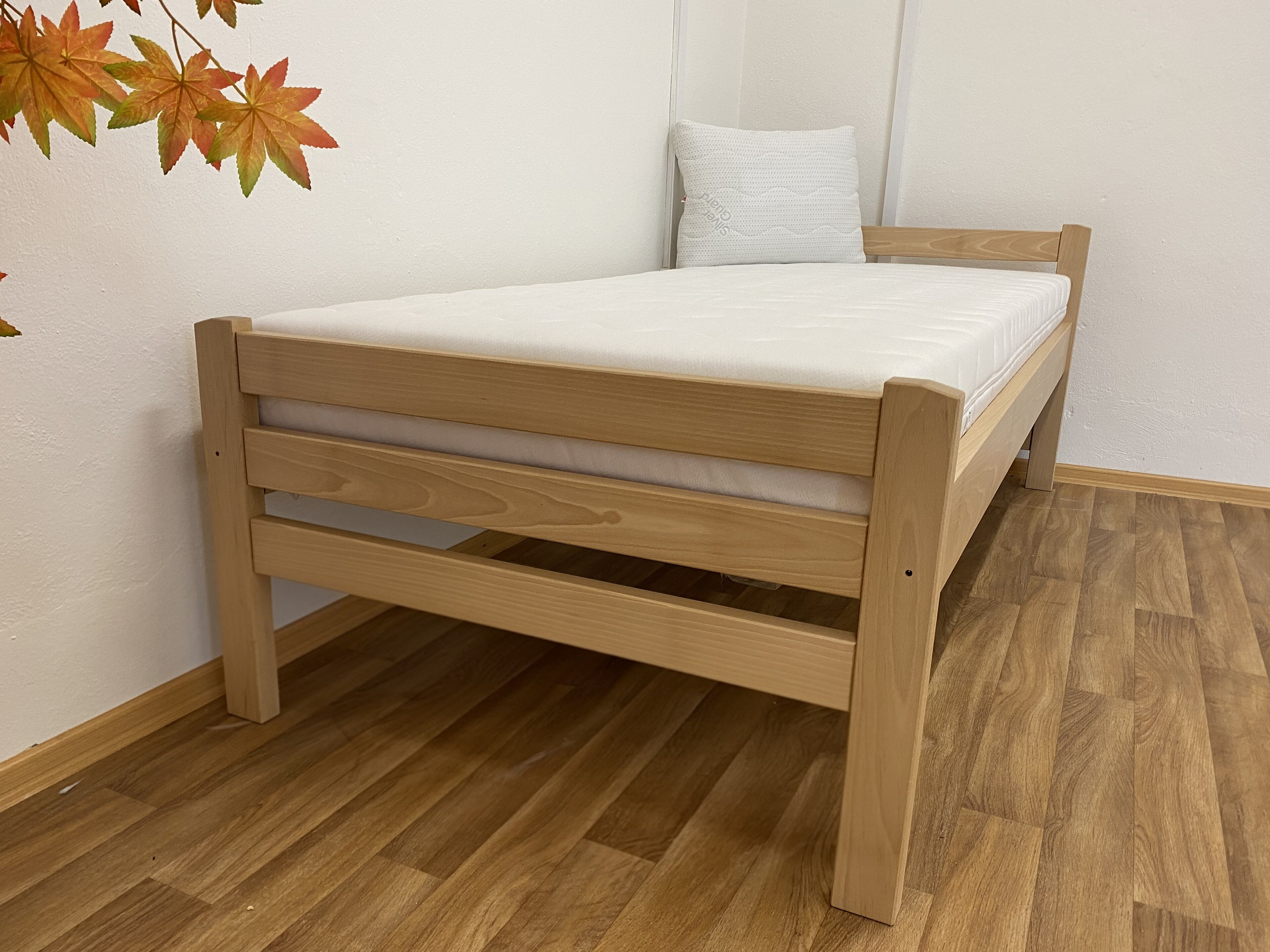 Masivní postel 90x200 cm. Postel je vyrobená z bukového masivu. Dřevěná konstrukce postele je povrchově upravena lakem s odolnou tvrdostí proti poškrábání. Rozměr lehací plochy je 90 x 200 cm. Nosnost do 120 Kg. Matrace a rošt není součástí postele, můžete si je objednat z naší nabídky. Postel je vyrobena z masivu o síle 3 cm. Tato síla masivu, zajišťuje dostatečnou pevnost a stabilitu.