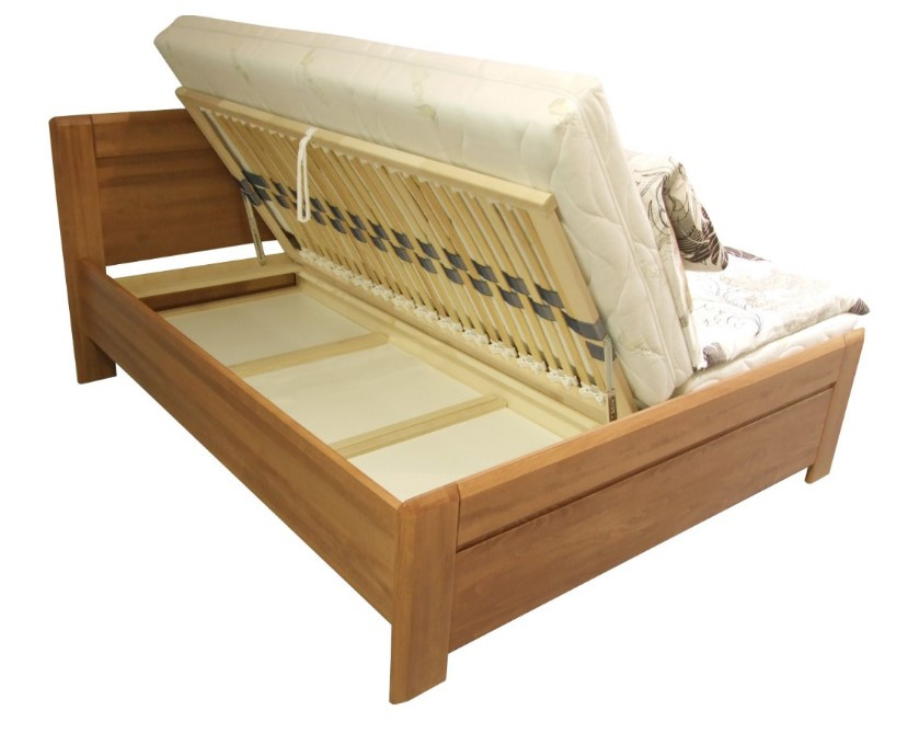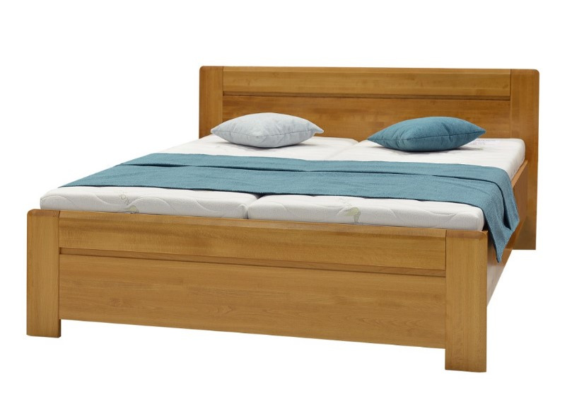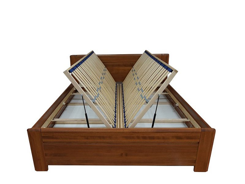 Extra zvýšené masivní dvoulůžko ARES z lakovaného bukového dřeva je široké 180 cm. Dvě atraktivní barevné provedení: ořech tmavý a ořech světlý. Součástí postele je praktický úložný prostor a rošty s bočním výklopem pomocí plynových pístů. V ceně nejsou matrace, které si můžete vybrat z naší nabídky. Postel je určená pro 2 matrace o rozměrech 90 x 200 cm.