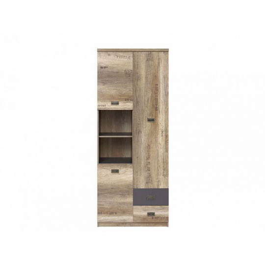 Kolekce nábytku Malcolm se opírá o nejnovější trendy v zařizování pokojů pro děti a studenty. Vyznačuje se moderním provedením dvířek a korpusů s výraznými grafickými akcenty, v barevném provedení: Dub canyon monument s 3D potiskem. Barva dřeva dub canyon monument vytváří zajímavý kontrast s moderní barvou - šedý wolfram. Na zajímavém pozadí krásně vyniknou praktické, kovové úchyty v barvě starého zlata.