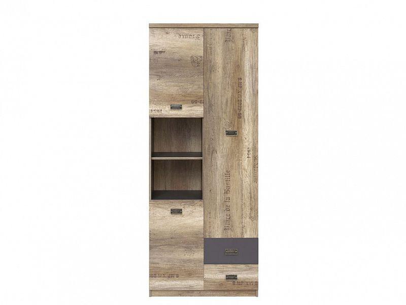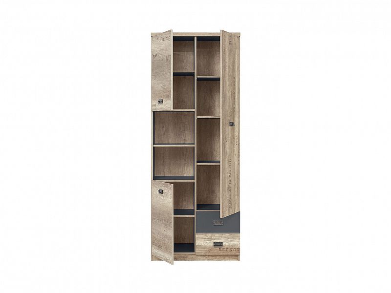 Kolekce nábytku Malcolm se opírá o nejnovější trendy v zařizování pokojů pro děti a studenty. Vyznačuje se moderním provedením dvířek a korpusů s výraznými grafickými akcenty, v barevném provedení: Dub canyon monument s 3D potiskem. Barva dřeva dub canyon monument vytváří zajímavý kontrast s moderní barvou - šedý wolfram. Na zajímavém pozadí krásně vyniknou praktické, kovové úchyty v barvě starého zlata.