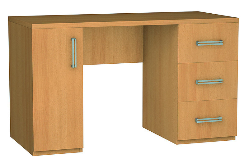 Psací stůl má velkou stolovou desku - 130 x 60 cm po stranách skříňku s dvírky a 3 šuplíky. Velký výběr barevného provedení, včetně kombinace barev. Výběr kovových úchytů.