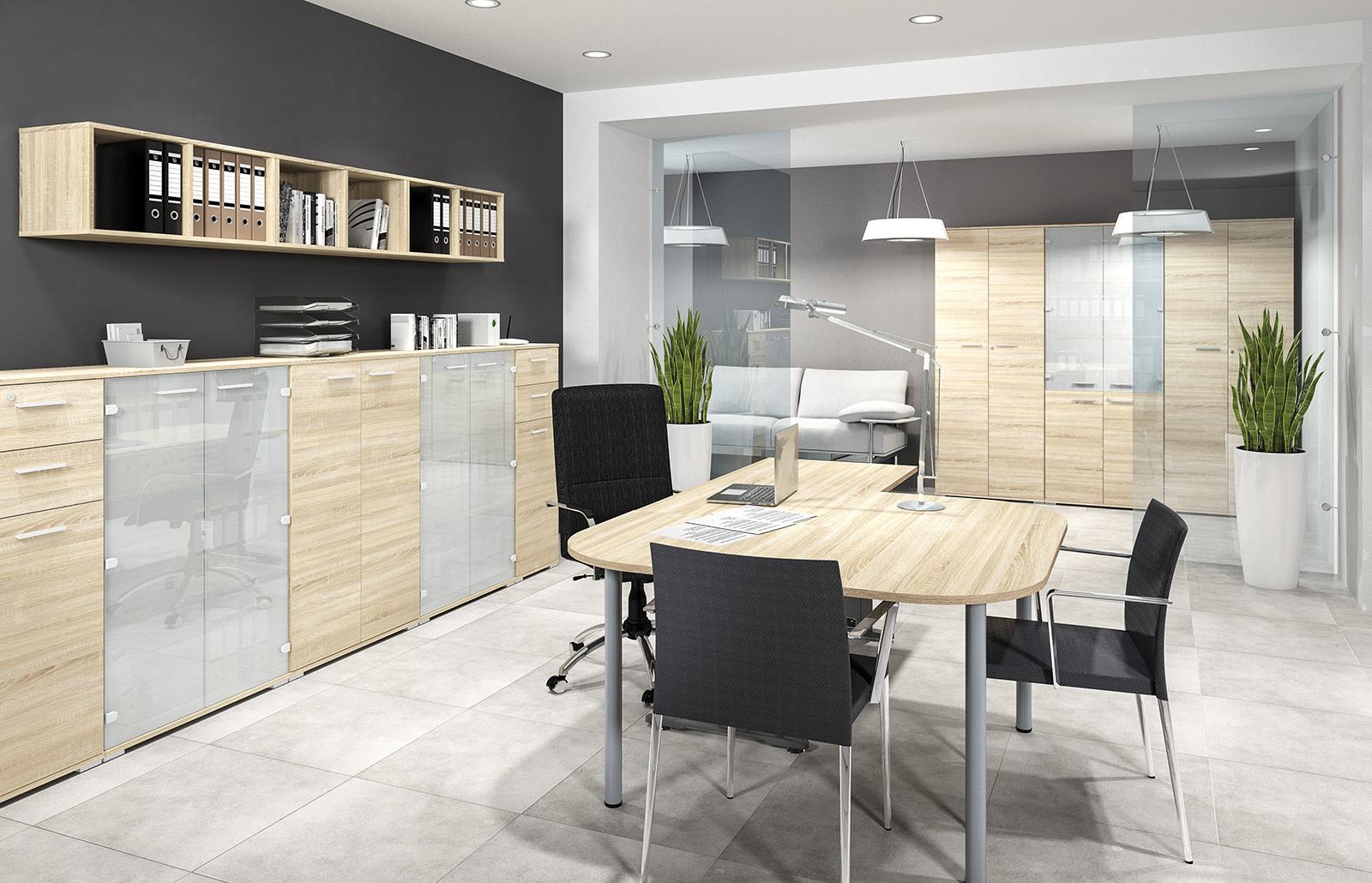 Optimal kancelářský nábytek je ideální pro vybavení klasických kancelářských prostorů, kanceláří a konferenčních místností. Skládá se z řady skříněk, knihoven a komod, které slouží k zakládání dokumentů v kanceláři. Široká škála stolů z vysoce kvalitní lamino MDF desky o tloušťce 22 mm a 2 mm a hrany ABS, založené na kovových podkladech, nabízí mnoho variant uspořádání. Další důležitou výhodou je také uzamykatelnost skříňek a kontejnerů.