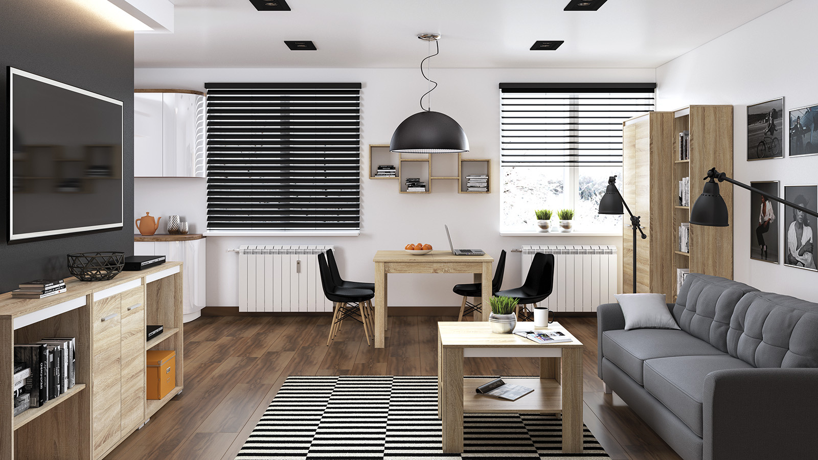 Sektorový nábytek AVO je v barevném provedení: dub sonoma ( korpus + čelní plochy ), dub sonoma + antracit + bílá ( výměnná lišta )