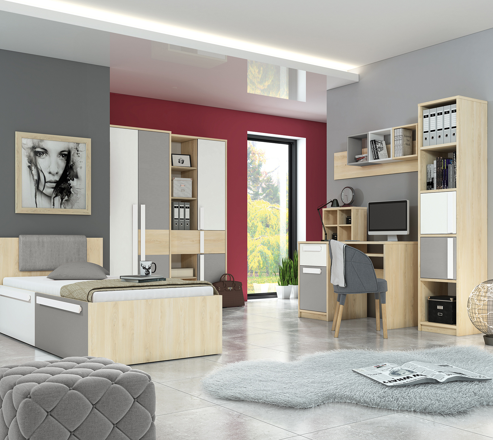 Moderní systém DROP je navržen podle nejnovějších trendů. Přírodní barvy nábytku a geometrický tvar rukojeti podtrhují jeho jednoduchost a praktičnost. Sektor je ideální pro studentské pokoje. Díky rozmanitosti jednotlivých prvků Vám systém DROP umožňuje vytvářet individuální uspořádání přizpůsobené chlapeckému i dívčímu pokoji. Systém DROP se skládá z 20 dílů v různých barevných kombinacích. Nábytek je vyroben z lamino desky vysoké kvality, která je odolná proti poškrábání, vlhkosti a vysokým teplotám.