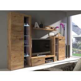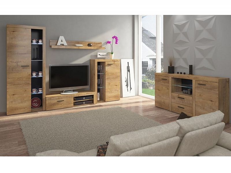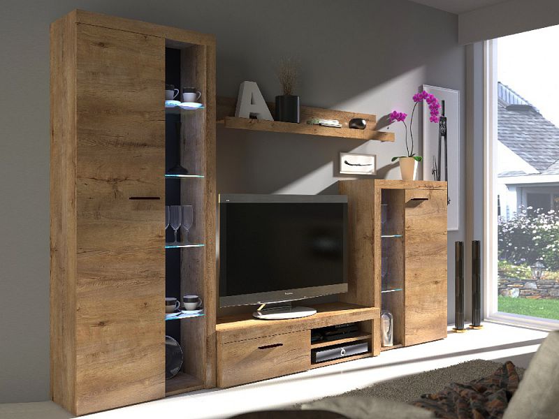 Moderní, obývací stěna ROBIN, v atraktivním barevném provedení dub lefkas. Nábytek je vyroben je z vysoce kvalitního lamina odolné proti poškrábaní a vlhkosti. K obývací stěně je možno dokoupit LED osvětlení.