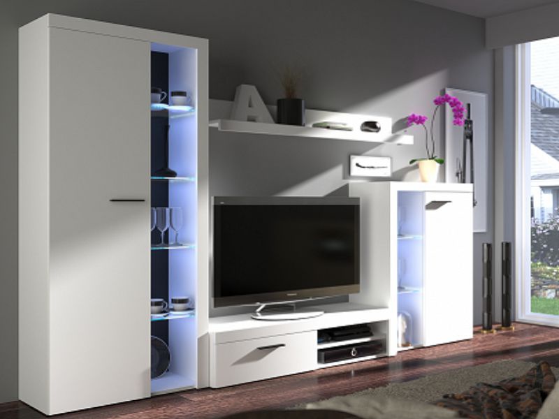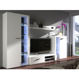 Moderní, obývací stěna ROBIN PLUS, v atraktivním barevném provedení bílá. Nábytek je vyroben je z vysoce kvalitního lamina odolné proti poškrábaní a vlhkosti. K obývací stěně je možno dokoupit LED osvětlení.
