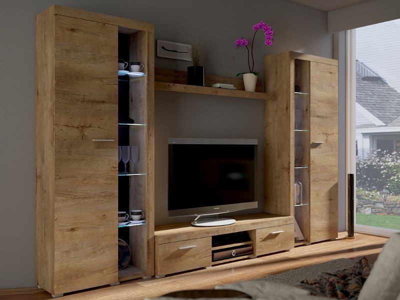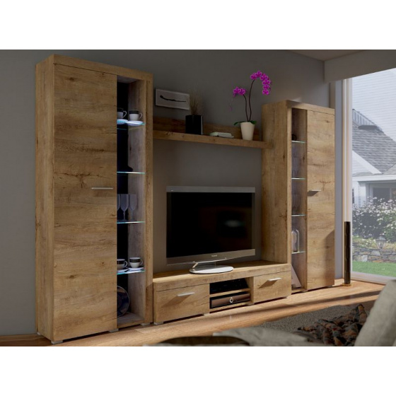 Moderní, obývací stěna ROBIN PLUS, v atraktivním barevném provedení dub lefkas. Nábytek je vyroben je z vysoce kvalitního lamina odolné proti poškrábaní a vlhkosti. K obývací stěně je možno dokoupit LED osvětlení.