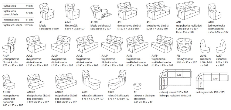 Rozměry nabízené sestavy: AUK+A1UBP+AR+A3UP - s úložným prostorem, za příplatek možno objednat rozkládání.