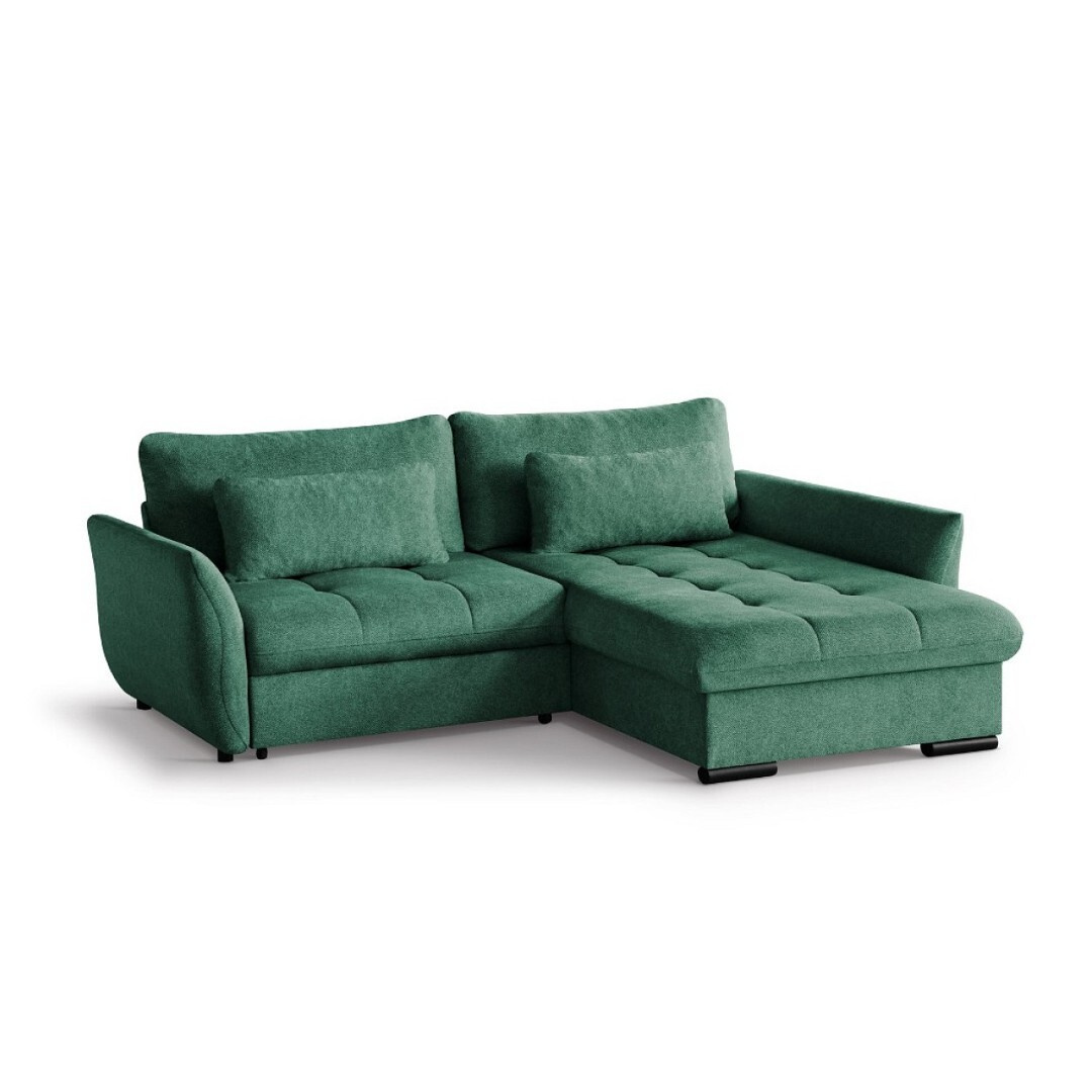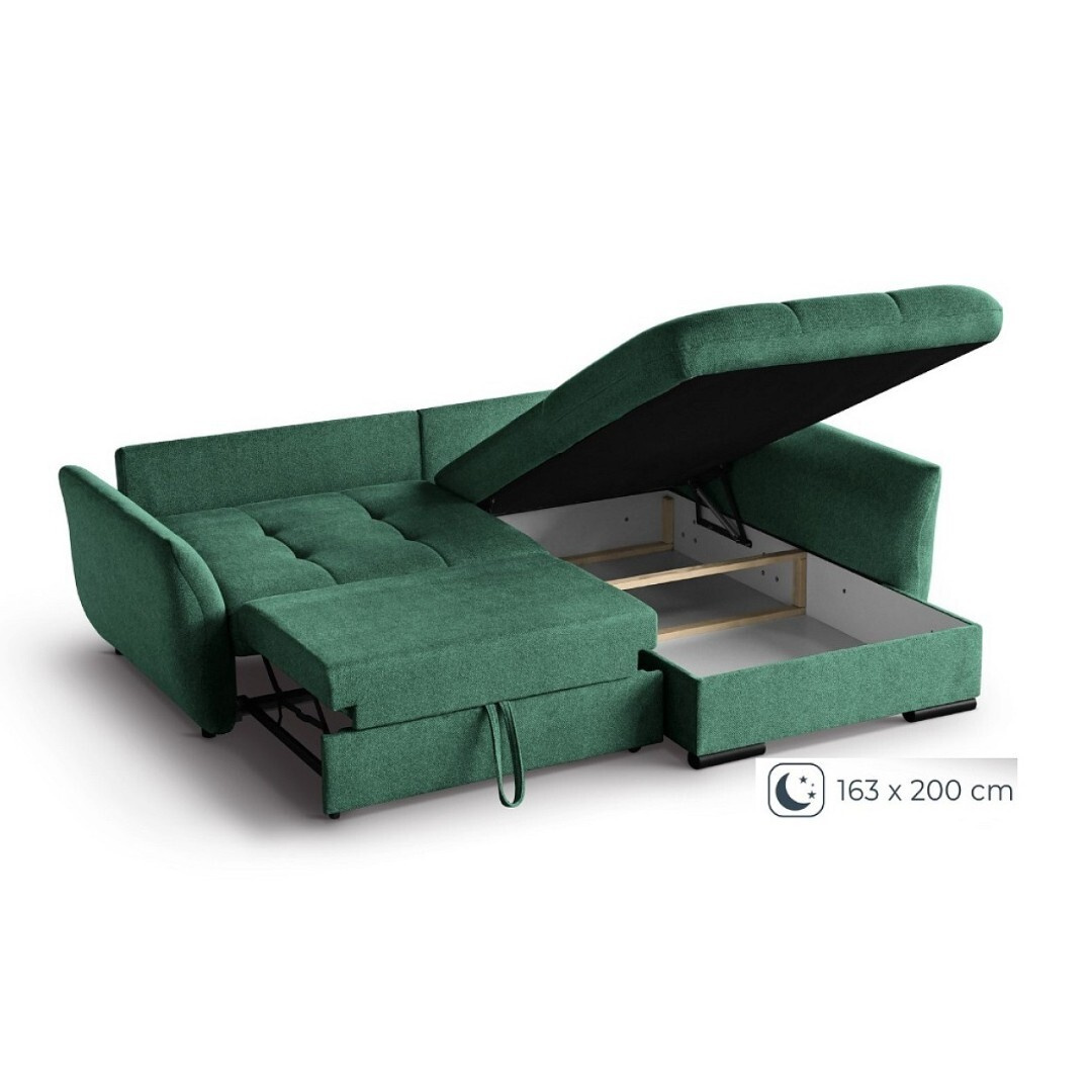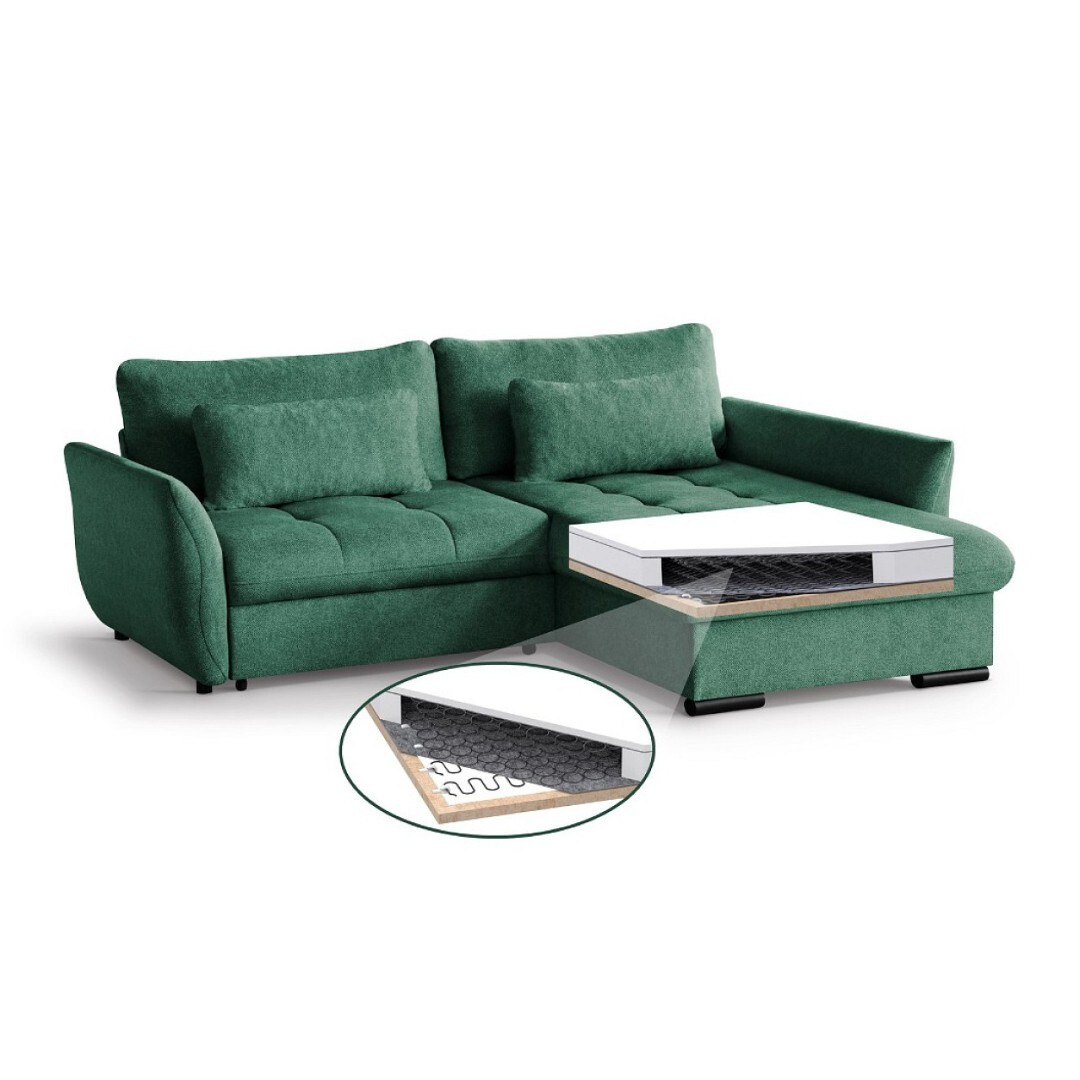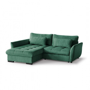 Rohová sedací souprava ANETA. Tato sedačka ve světlém provedení, upoutá pozornost nejednoho zákazníka. Její rohové provedení je levé nebo pravé z pozice sedícího. Barevné provedení sedací soupravy je v zelené barvě látky Bubble 12. Tato látka je v úpravě watter repellent, nevsakuje tekutiny a snadno se čistí. Rozklad je očalouněný totožnou látkou, což dodá na luxusním vzhledu. Pohodlné sezení zabezpečuje komfortní Bonellová pružina. Díky čemuž je zajištěn vysoký komfort při spánku. Rohovka je po rozložení vhodná k dennímu spaní. Rozklad typu Delfin ma velikost spací plochy 163 x 200 cm.