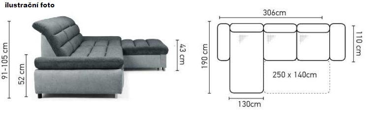 Rozměry: 284 x 215 cm, v. 91 - 105 cm, výška sedu 43 cm, volitelná hloubka sedu 50 - 73 cm