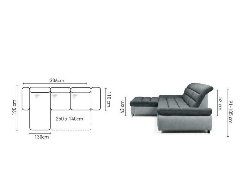 Rozměry: 306 x 190 cm, v. 91 - 105 cm, výška sedu 43 cm, volitelná hloubka sedu 50 - 73 cm
