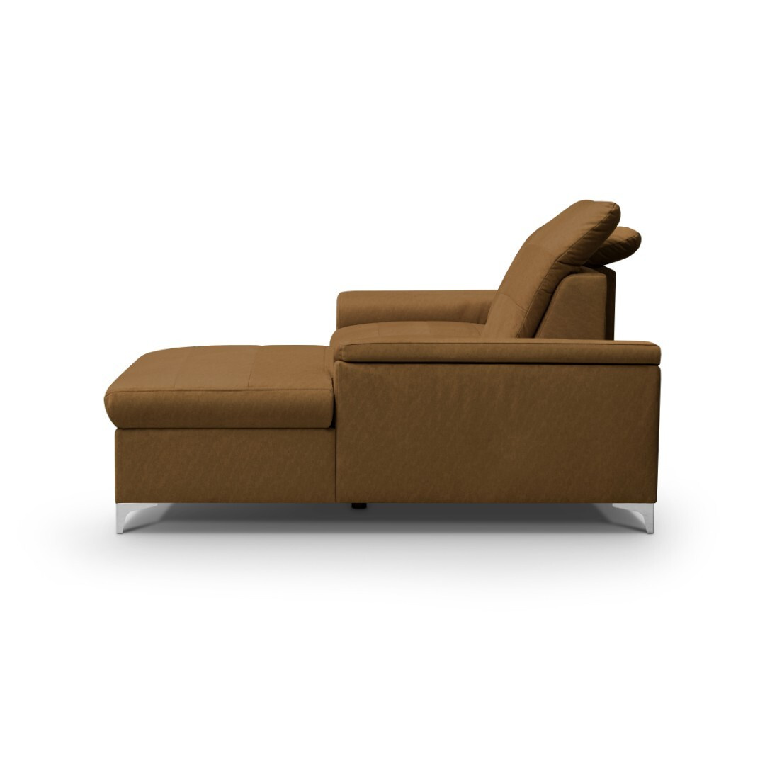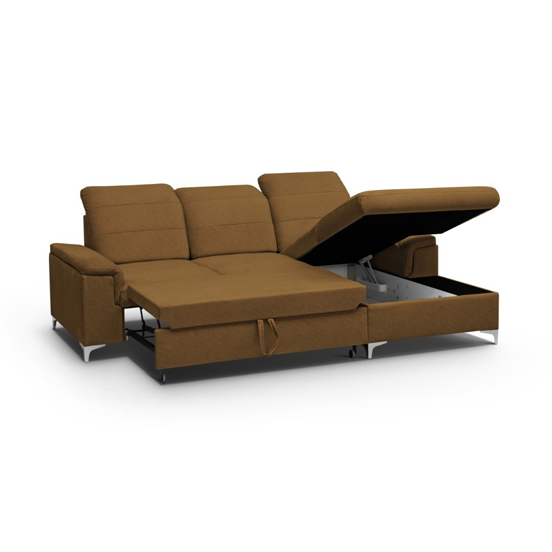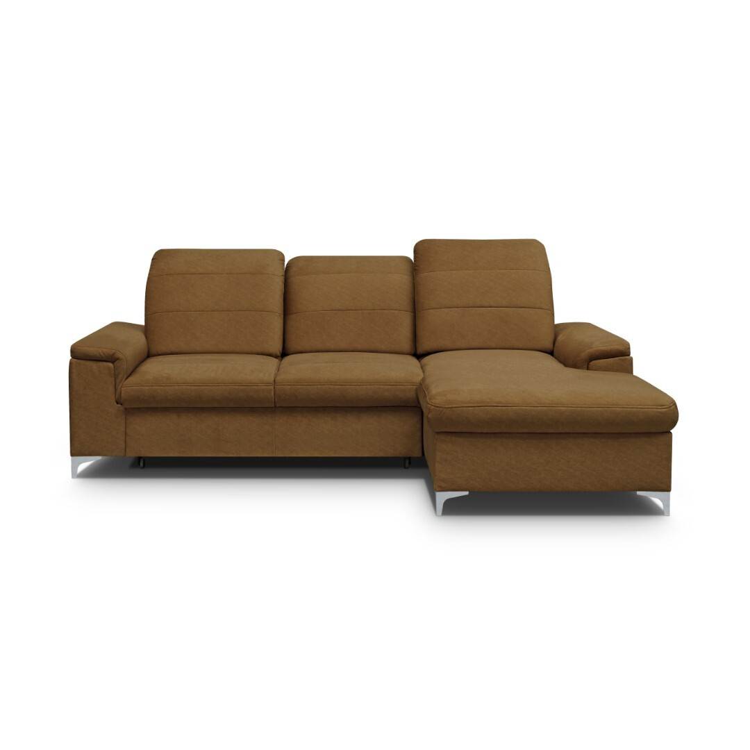 Moderní rohová sedací souprava BENET je rozkládací s úložným prostorem. Rozložení sedačky je jednoduché díky mechanismu Delfín. Rozměry spací plochy po rozložení jsou 198 x 140 cm. V rohové části se nachází úložný prostor, který je dostatečně veliký pro uschování lůžkovin a denních dek. Pohodlí při sezení zajistí pěna t2830 a vlnitá pružina. Dozajista také oceníte možnost úpravy hloubky sedu dle vašich potřeb - 3x volitelná hloubka sedu 56-72 cm. Dále pak 3x polohovací podhlavník - automat. Nožky sedací soupravy BENET jsou kovové. Barevné provedení sedačky je ve hnědé barvě. Dekorativní prošití na sedadle a opěradle.