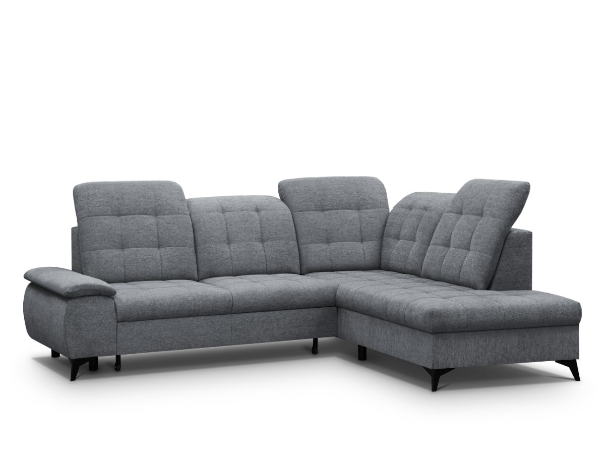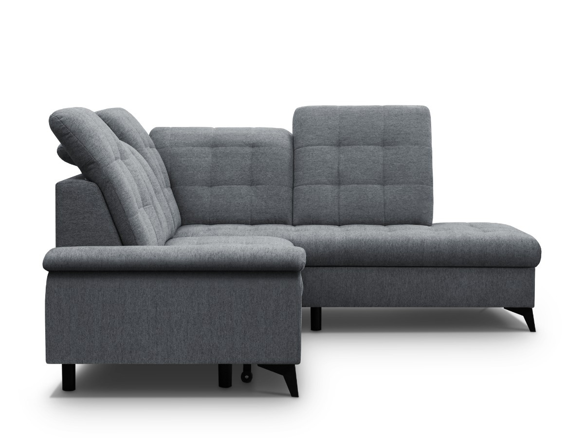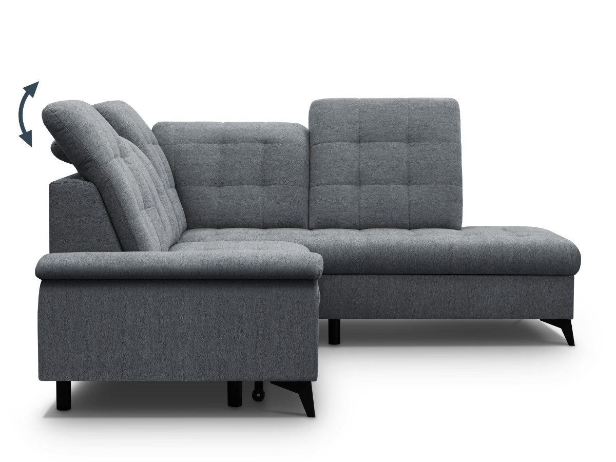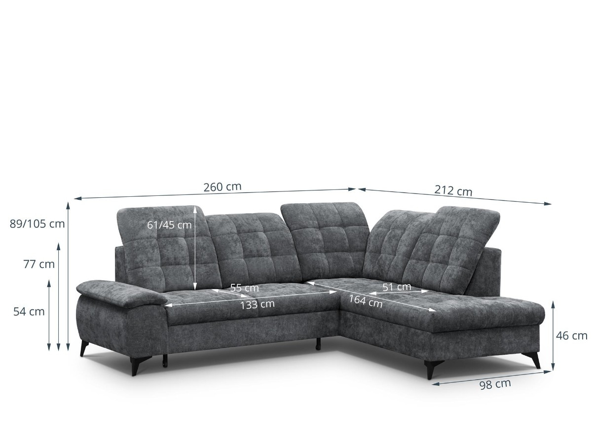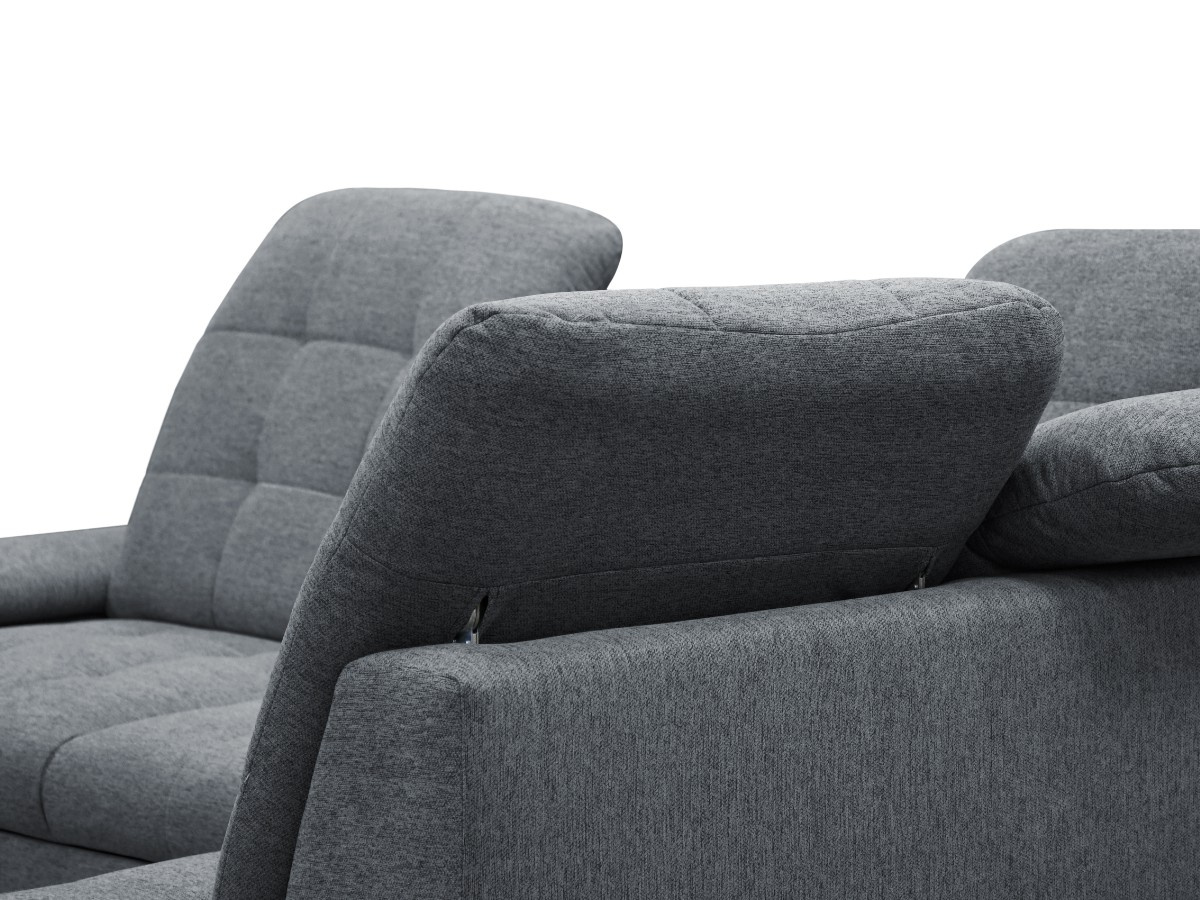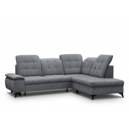 Rohovou sedací soupravu BRIAN je vhodné během dne využít jako místo k sezení u televize, večer pro příležitostné přespání. Sedací souprava je potažená látkou ve tmavě šedé - Gemma 90. Čalouněna jsou také záda - vhodné k umístění do prostoru. Součástí sedačky je úložný prostor a možnost rozkladu. Spací plocha je o rozměrech 120 x 184 cm. Úložný prostor je vhodný pro uschování denních dek nebo sezónních věcí. Sedací souprava má polohovatelné záhlavníky. Kovové černé nožky a výrazné prošití sedáku a opěráku.