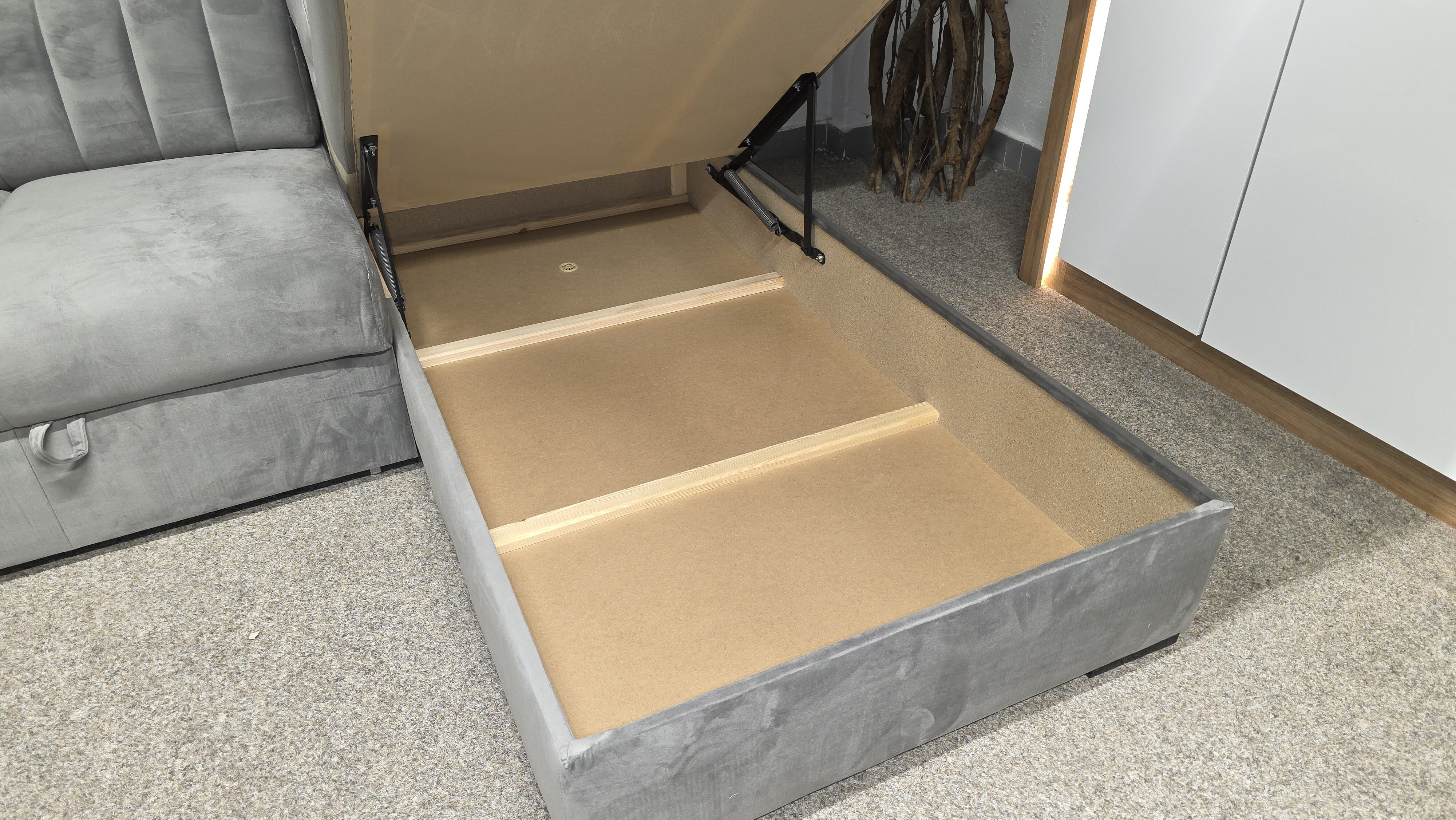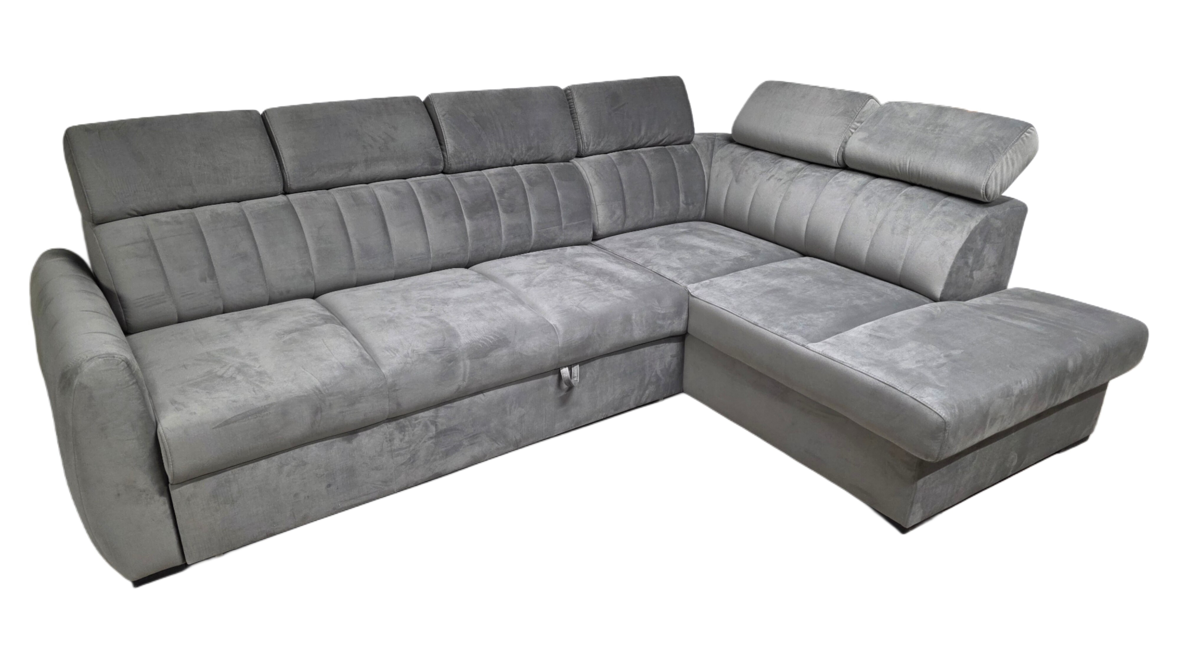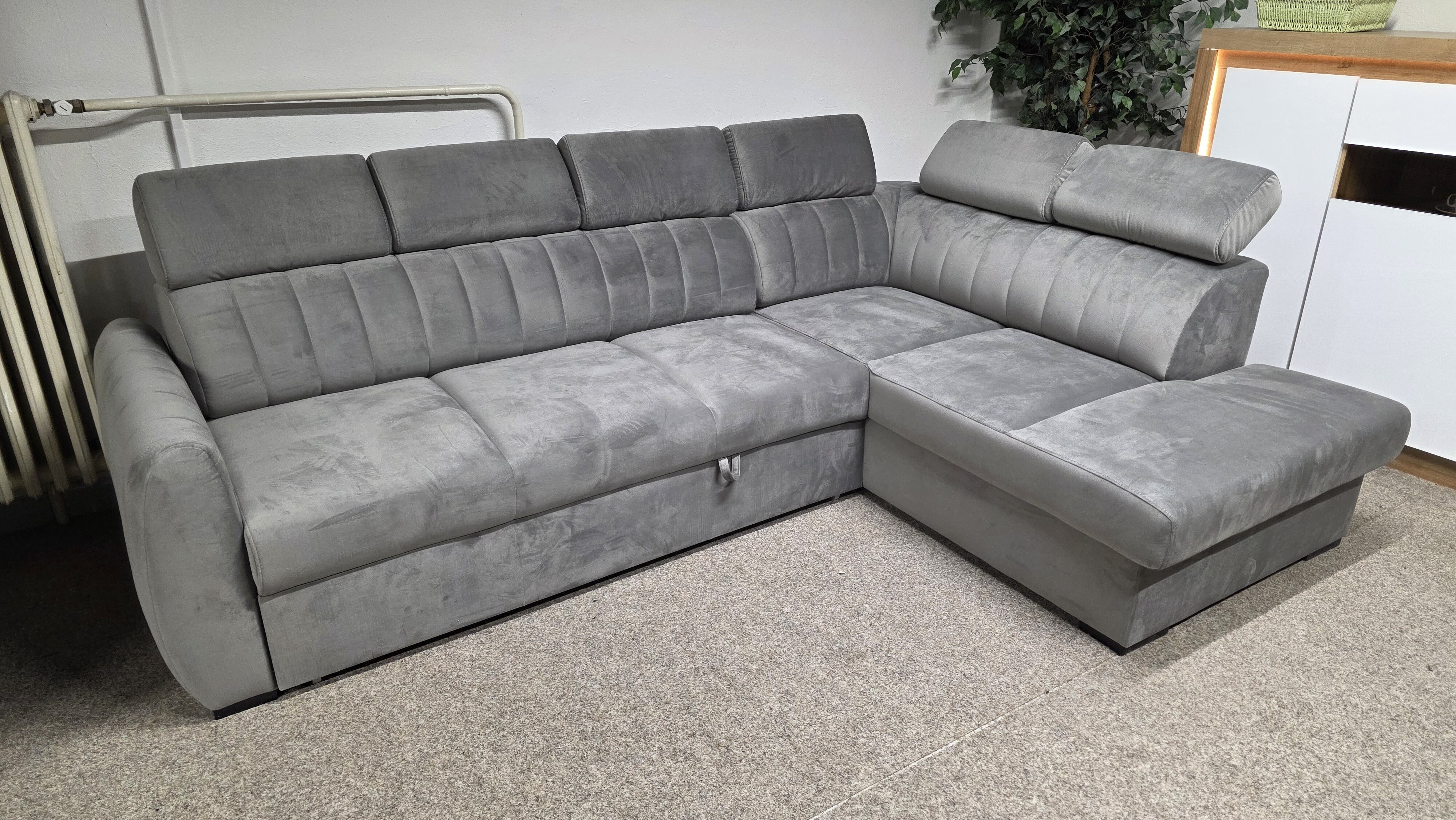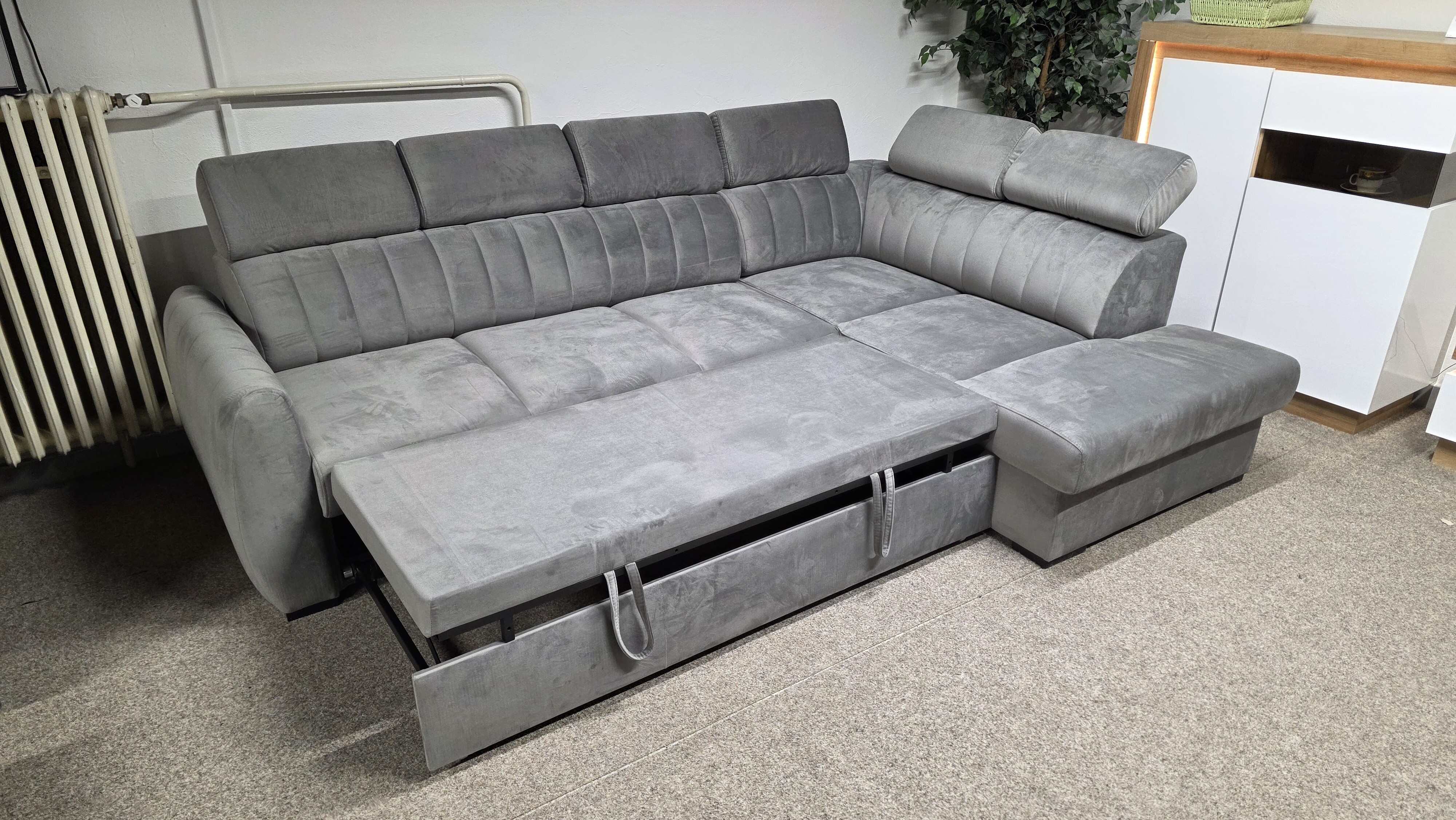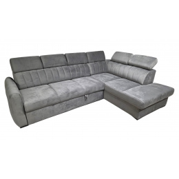 Rohová sedací souprava CASTEL s výškově stavitelnými podhlavníky. Sedačka je rozkládací s úložným prostorem. Po rozkladu vznikne plocha pro příležitostné spaní o rozměrech 130 x 190 cm. Sedací souprava je v pravém provedení rohu. Sedací souprava je očalouněna šedou látkou RIVIERA 91, včetně zad sedačky, můžete ji umístit do prostoru. Pohodlí při sezení podpoří polohovatelné opěrky hlavy. Výška sedačky je podle sklopení opěrek hlavy 85 až 100 cm. Sedák je vyplněný kvalitní studenou HR pěnou položenou na vlnité pružině FALISTE - zaručuje komfortní posezení. Konstrukce je vyrobená z masívního dřeva.