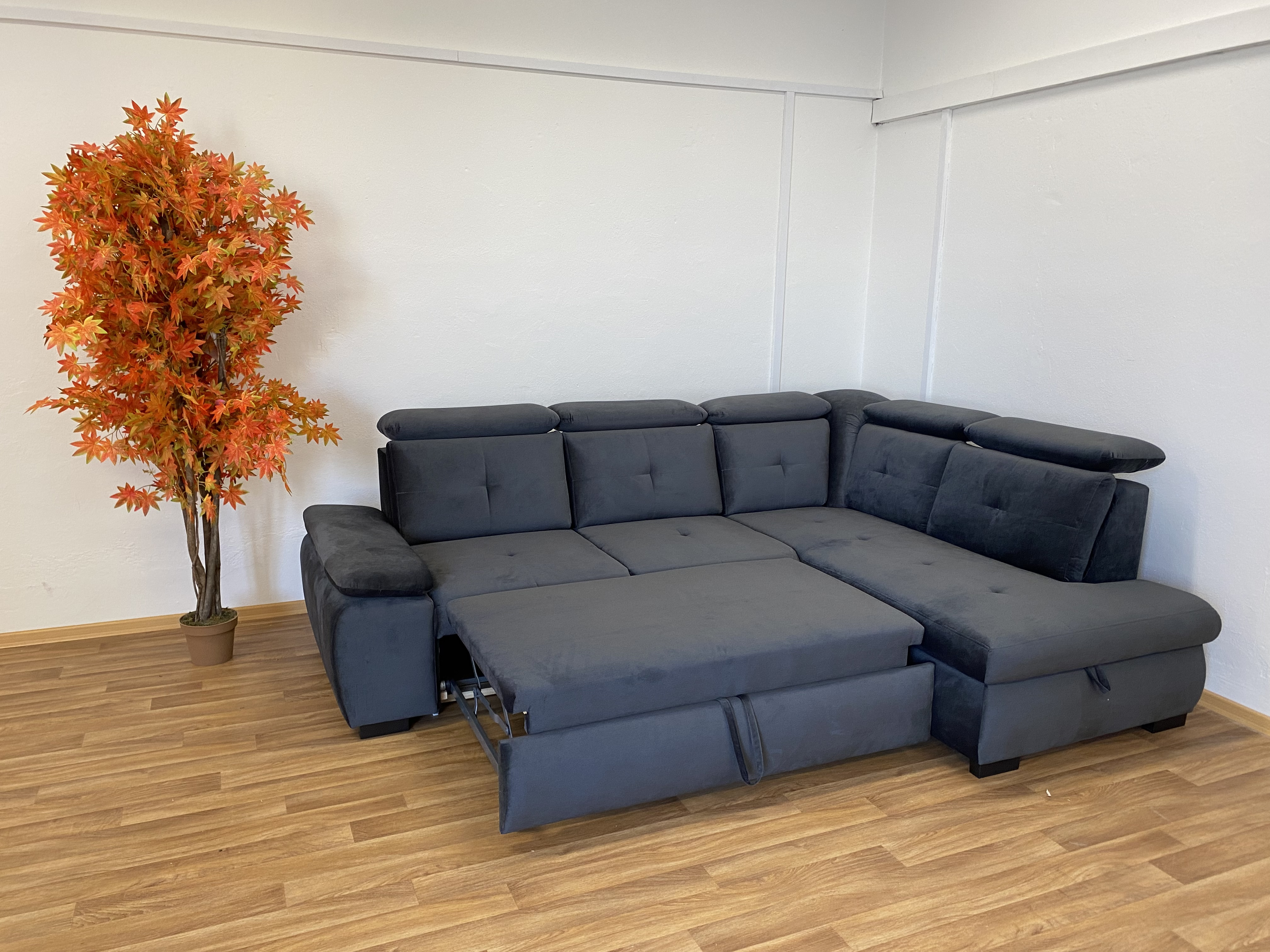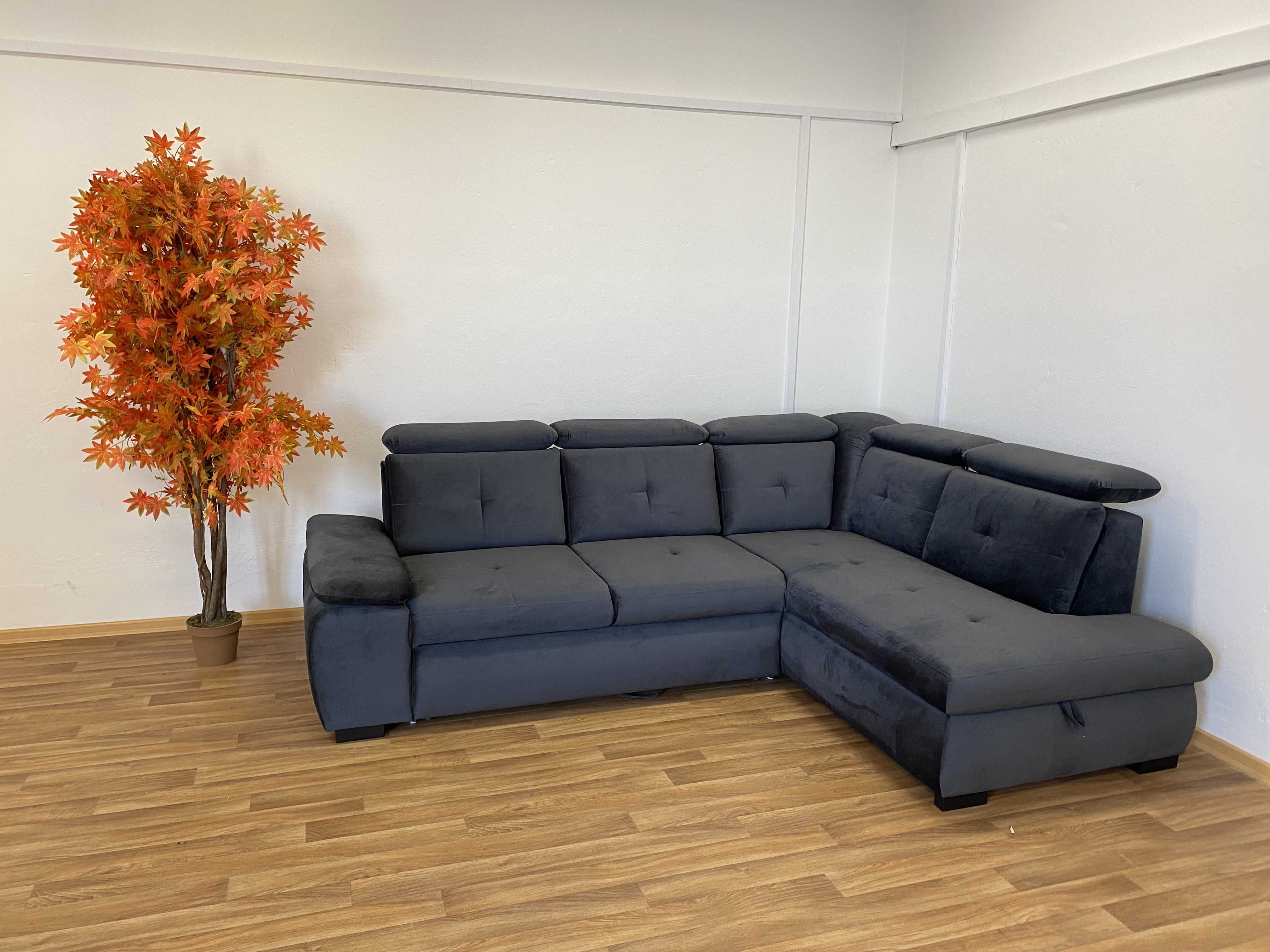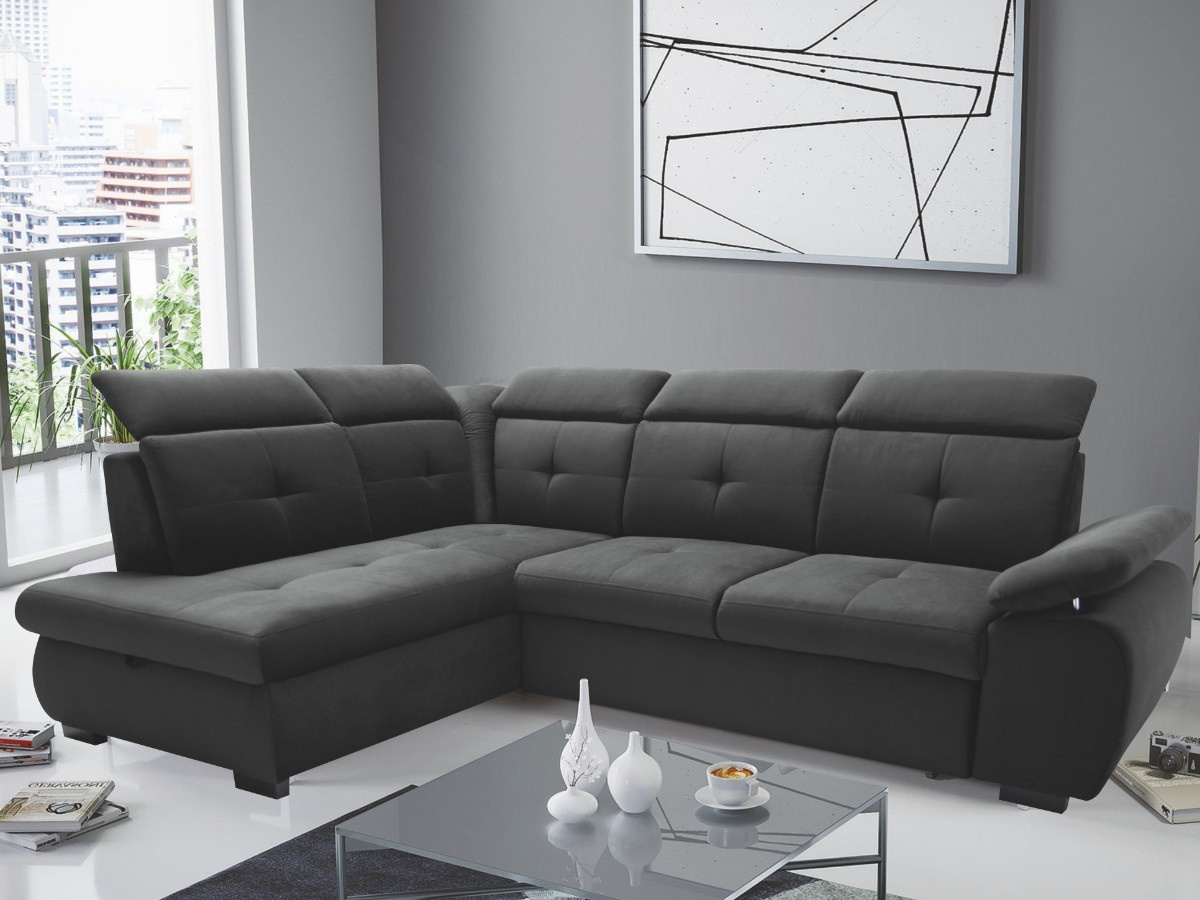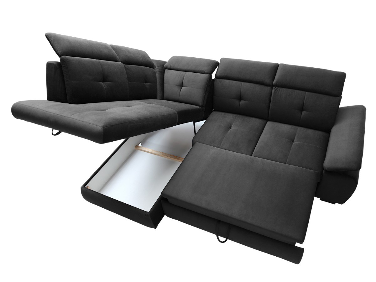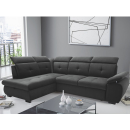 Pohodlná a moderní rohová sedací souprava CATRINE. Sedačka je rozkládací s úložným prostorem. Výplň opěrných polštářů je PUR pěna, sedák je vyplněn vlnitou pružinou a PUR pěnou. Po rozložení vznikne spací plocha o rozměrech 126 x 183 cm, je vhodná na příležitostné spaní. V barevném provedení Kronos 34 - grafitová, viz foto. Sedačka je v pravém nebo levém rohovém provedení. Záhlavníky i područka jsou polohovací.