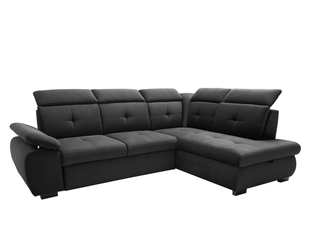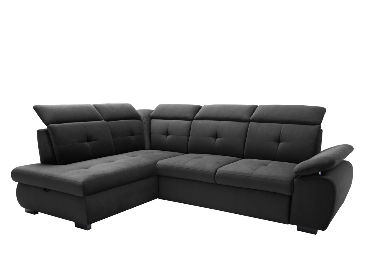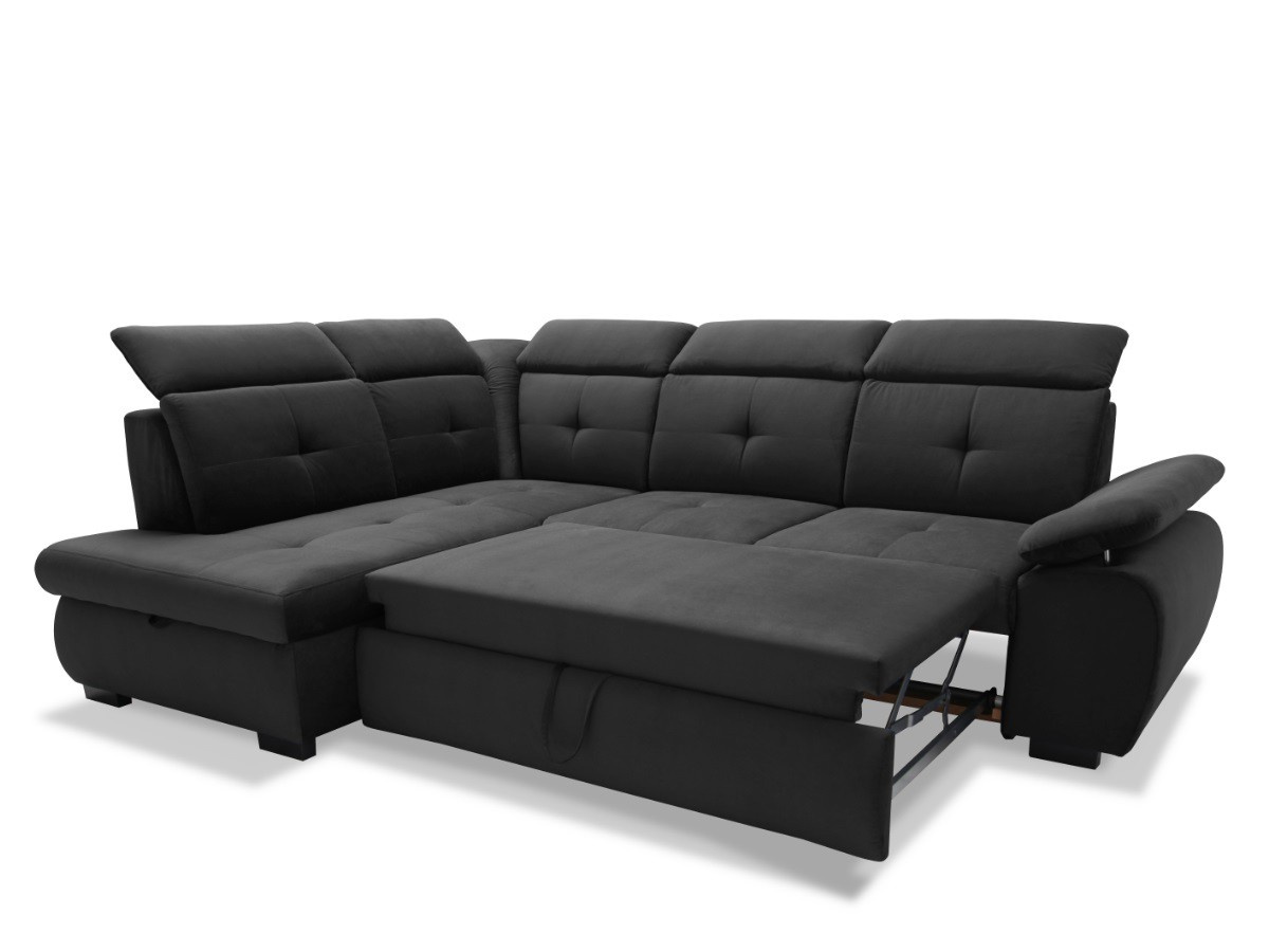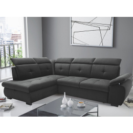Pohodlná a moderní rohová sedací souprava COLLIN. Výplň opěrných polštářů je PUR pěna, sedák je vyplněn vlnitou pružinou a PUR pěnou. Designový vzhled - výrazné prošití sedáků i opěráků. V barevném provedení Kronos 34 - tmavě šedá, viz foto. Sedačka je v pravém nebo levém rohovém provedení. Záhlavníky jsou polohovací. Nožky jsou zhotoveny ze dřeva. Sedačku si oblíbíte nejenom pro možnost sezení, ale také díky funkci rozkladu, kdy se na sedačce pohodlně vyspí vaše nečekaná návštěva. Velikost spací plochy je 126 x 183 cm. Rozklad je snadný díky systému DELFIN. Rozklad je očalouněný látkou stejné barvy, jako je celá sedací souprava. Nechybí ani úložný prostor v otomanu.