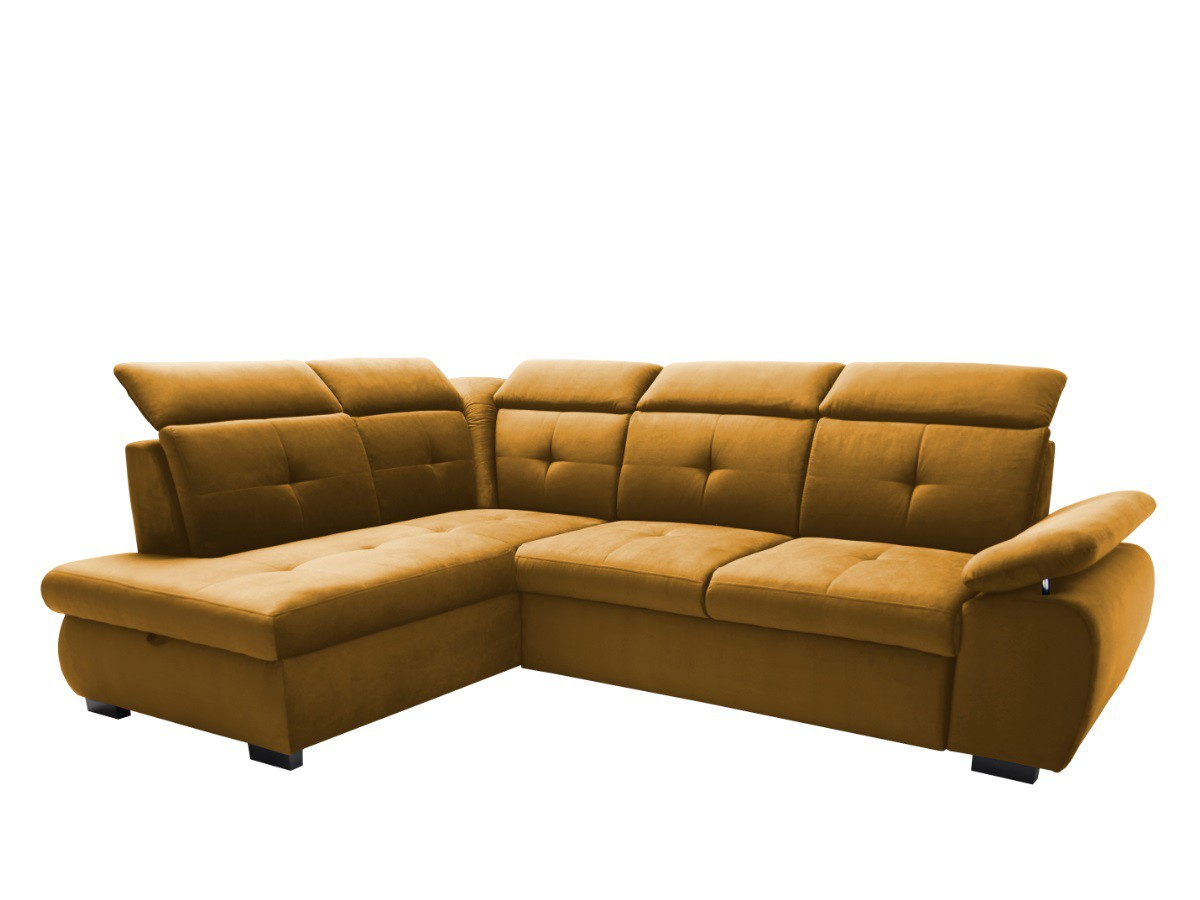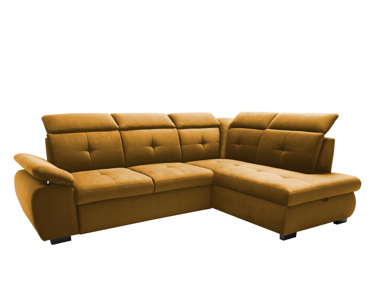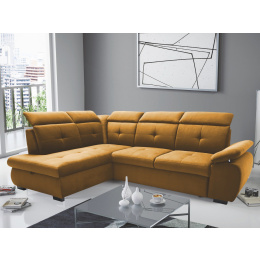 Pohodlná a moderní rohová sedací souprava COLLIN. Výplň opěrných polštářů je PUR pěna, sedák je vyplněn vlnitou pružinou a PUR pěnou. Designový vzhled - výrazné prošití sedáků i opěráků. V barevném provedení Kronos 01 - hořčicová, viz foto. Sedačka je v pravém nebo levém rohovém provedení. Záhlavníky jsou polohovací. Nožky jsou zhotoveny ze dřeva. Sedačku si oblíbíte nejenom pro možnost sezení, ale také díky funkci rozkladu, kdy se na sedačce pohodlně vyspí vaše nečekaná návštěva. Velikost spací plochy je 126 x 183 cm. Rozklad je snadný díky systému DELFIN. Rozklad je očalouněný látkou stejné barvy, jako je celá sedací souprava. Nechybí ani úložný prostor v otomanu.