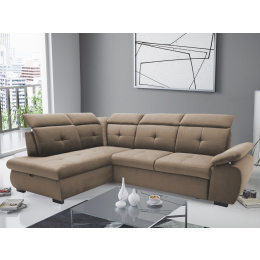 Pohodlná a moderní rohová sedací souprava COLLIN. Výplň opěrných polštářů je PUR pěna, sedák je vyplněn vlnitou pružinou a PUR pěnou. Designový vzhled - výrazné prošití sedáků i opěráků. V barevném provedení Paros 3 - světle hnědá, viz foto. Sedačka je v pravém nebo levém rohovém provedení. Záhlavníky jsou polohovací. Nožky jsou zhotoveny ze dřeva. Sedačku si oblíbíte nejenom pro možnost sezení, ale také díky funkci rozkladu, kdy se na sedačce pohodlně vyspí vaše nečekaná návštěva. Velikost spací plochy je 126 x 183 cm. Rozklad je snadný díky systému DELFIN. Rozklad je očalouněný látkou stejné barvy, jako je celá sedací souprava. Nechybí ani úložný prostor v otomanu.