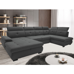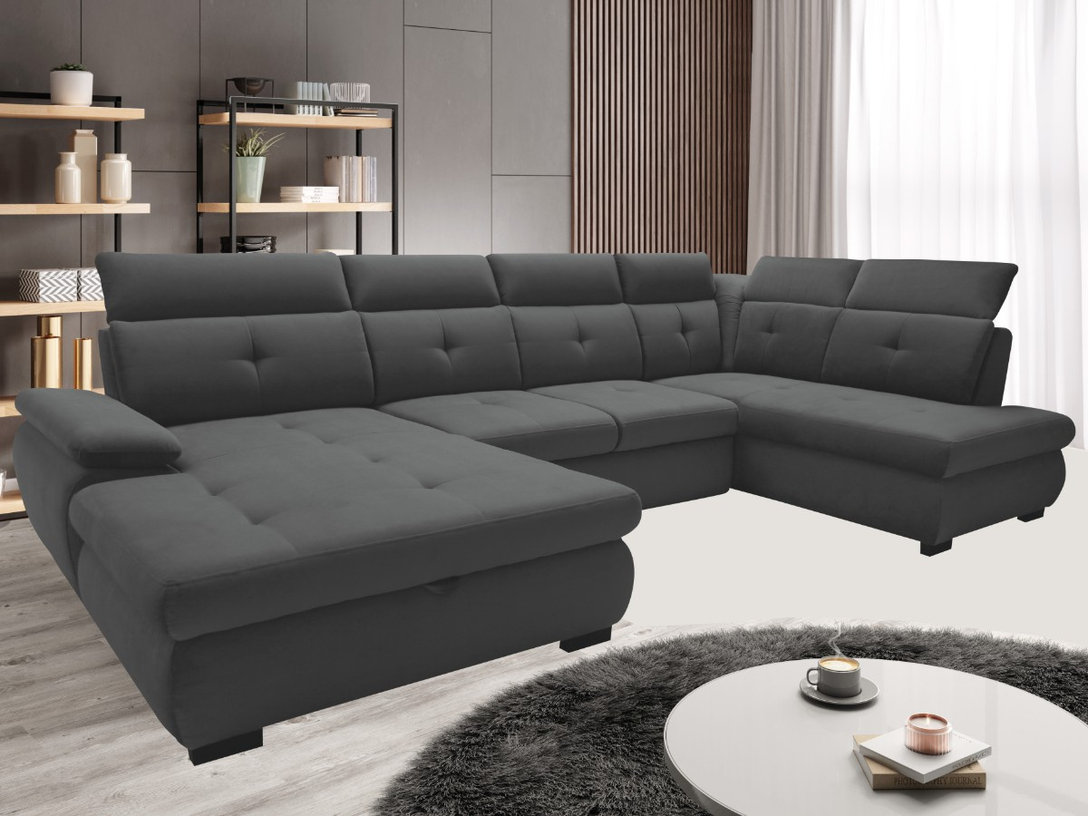 Pohodlná a moderní rohová sedací souprava do U CATRINE. Sedačka je rozkládací s úložným prostorem. Výplň opěrných polštářů je PUR pěna, sedák je vyplněn vlnitou pružinou a PUR pěnou. Po rozložení vznikne spací plocha o rozměrech 126 x 270 cm, je vhodná na příležitostné spaní. V barevném provedení Kronos 34 - grafitová, viz foto. Sedačka je v pravém nebo levém rohovém provedení. Záhlavníky i područka jsou polohovací.