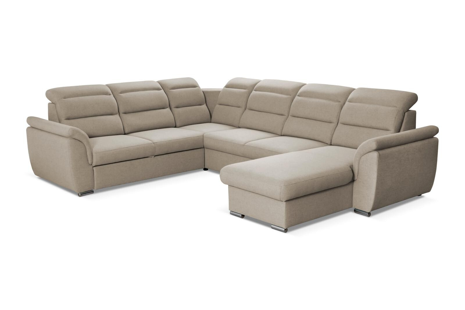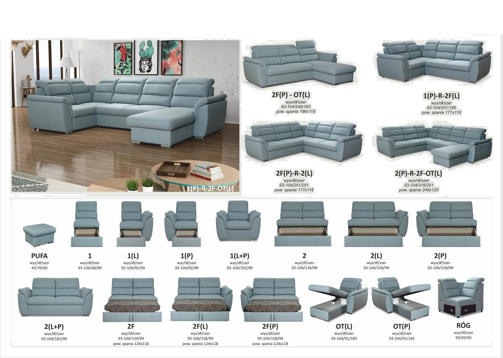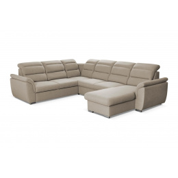 Elegantní rohová sedací souprava PULLA. Modulová sedací souprava PULLA je rozkládací s lůžkem pro příležitostné přespání, s úložným prostorem pro uskladnění dek a lůžkovin. Rohovka má polohovatelné opěrky hlavy. Sedací souprava se dodává v pravém nebo levém provedení. Očalouněná záda umožňují ustavit rohovku do prostoru. Sedačka má v sedací části pružinové vlnovce na kterých je uložená vysoce elastická HR pěny.