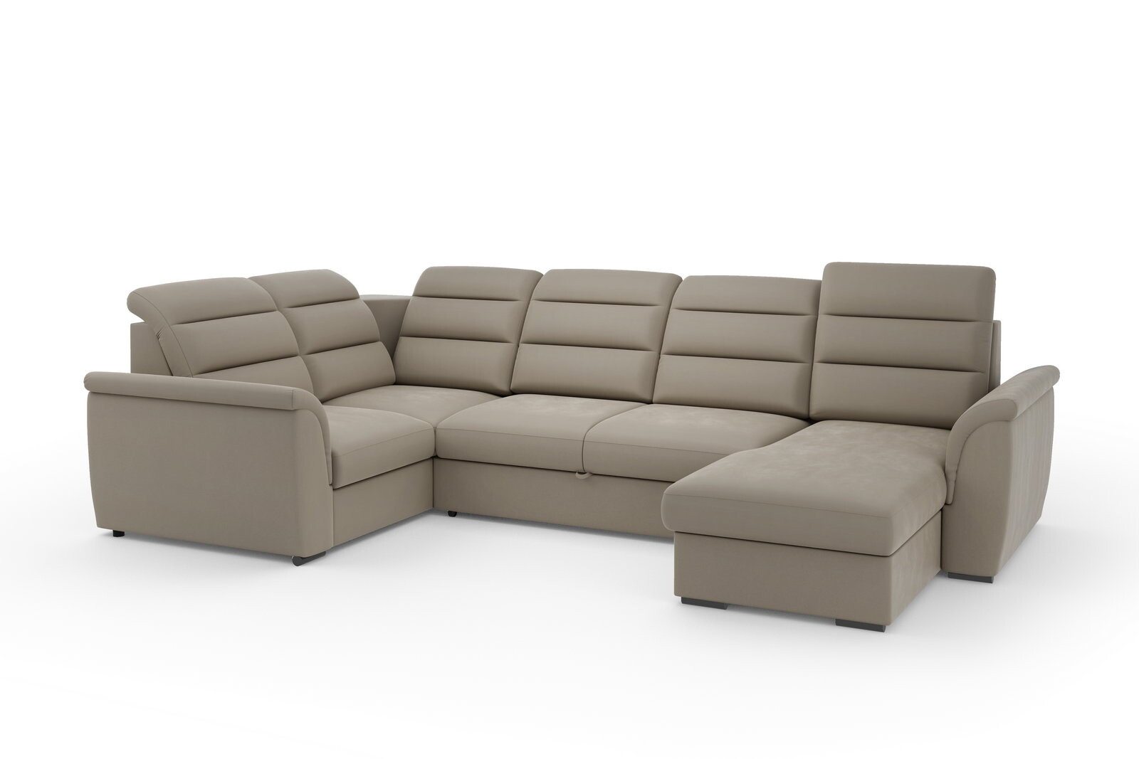 Elegantní rohová sedací souprava PULLA. Modulová sedací souprava PULLA je rozkládací s lůžkem pro příležitostné přespání, s úložným prostorem pro uskladnění dek a lůžkovin. Rohovka má polohovatelné opěrky hlavy. Sedací souprava se dodává v pravém nebo levém provedení. Očalouněná záda umožňují ustavit rohovku do prostoru. Sedačka má v sedací části pružinové vlnovce na kterých je uložená vysoce elastická HR pěny.