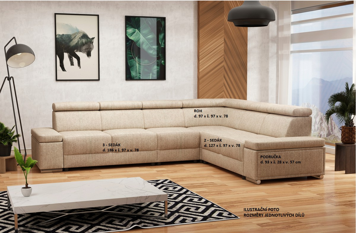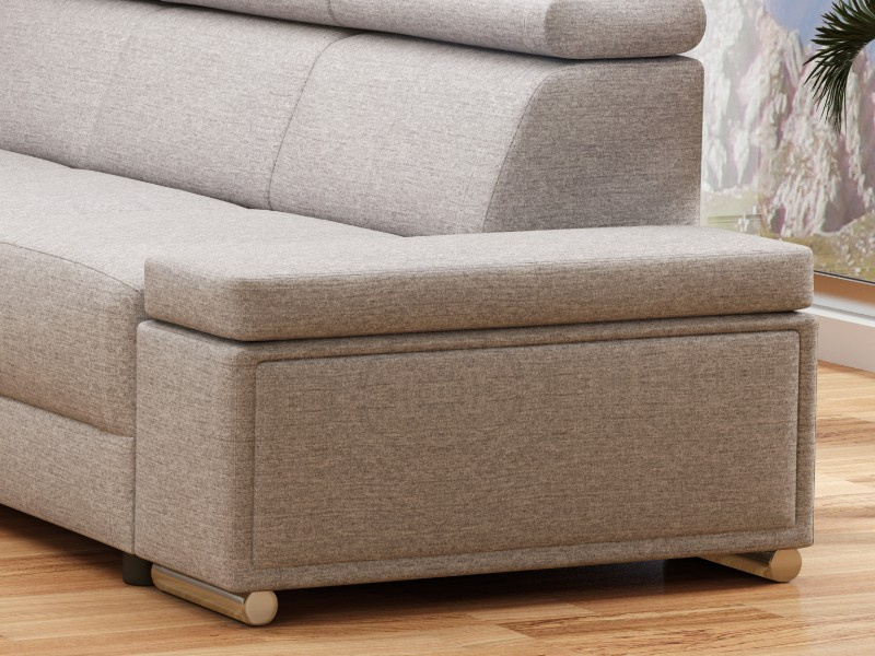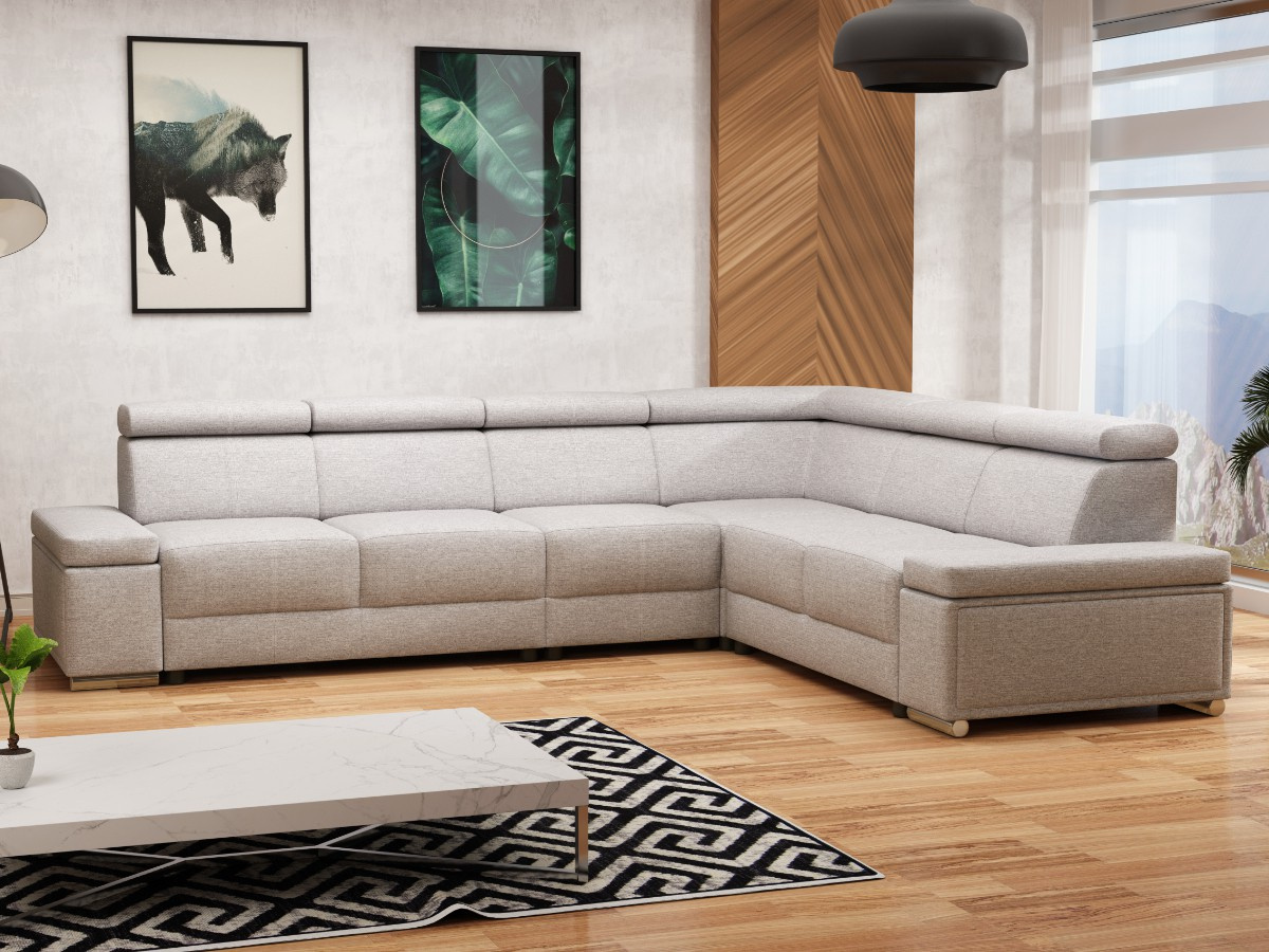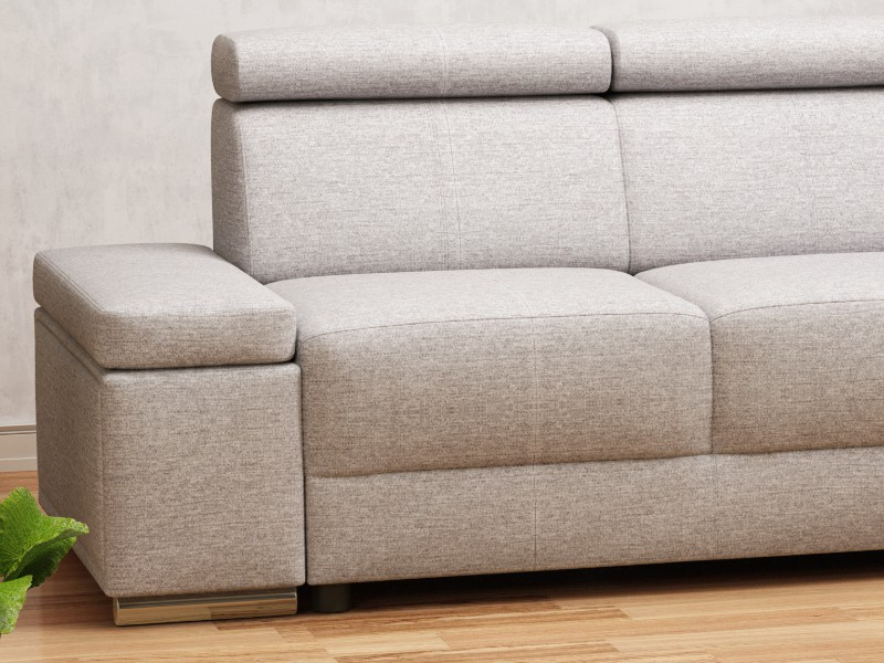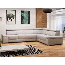 Rohová rozkládací sedací souprava ESSIA s výškově stavitelnými podhlavníky. Sedací souprava je univerzální. Před první montáží si určíte zda bude roh vlevo/vpravo. Sedací souprava je očalouněna světle šedou látkou Primo 84. Pohodlí při sezení podpoří polohovatelné opěrky hlavy. Výška sedačky je podle sklopení opěrek hlavy 78 až 98 cm. Sedák je vyplněný studenou HR pěnou a vlnitou pružinou. Sedací souprava má polohovací područky.