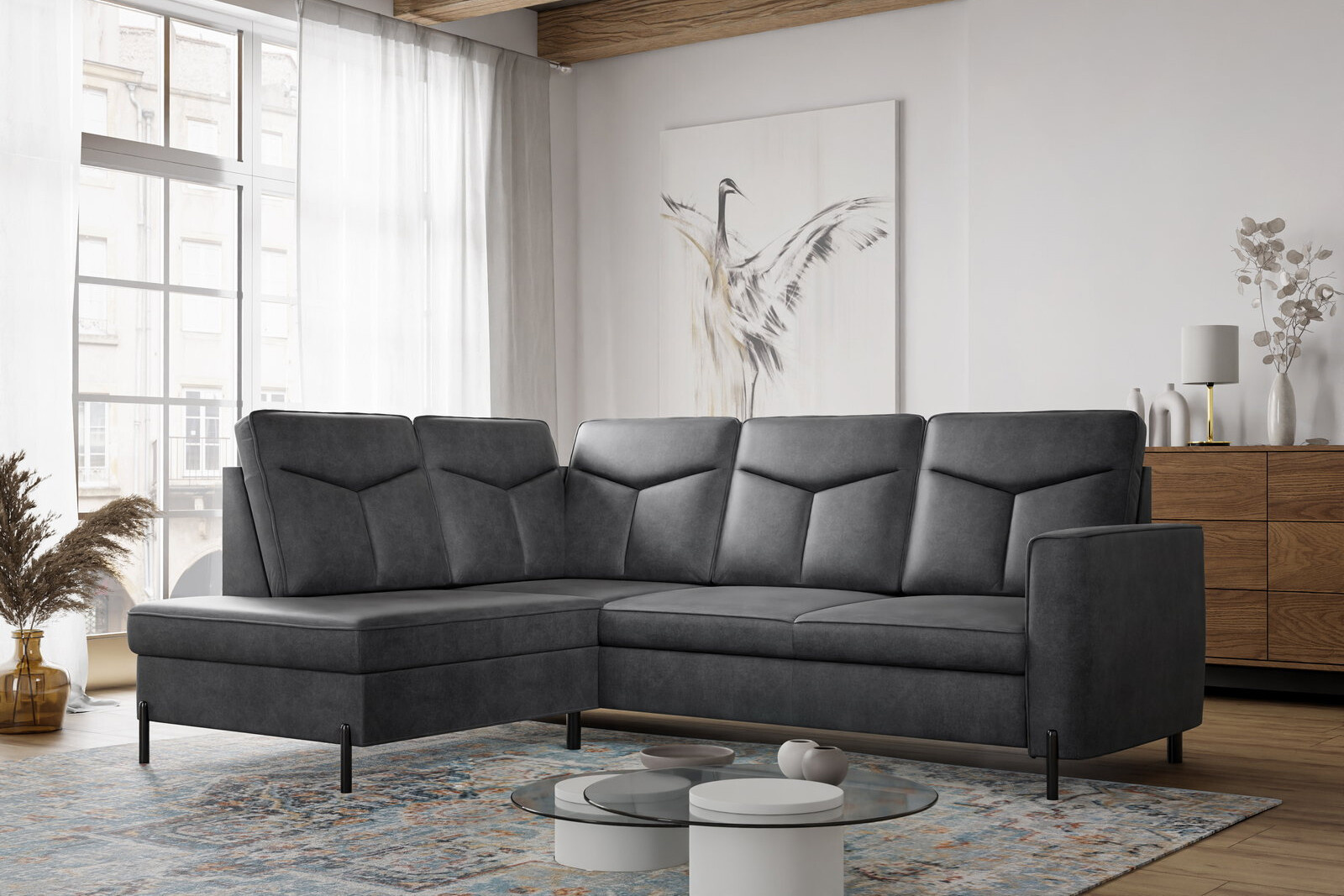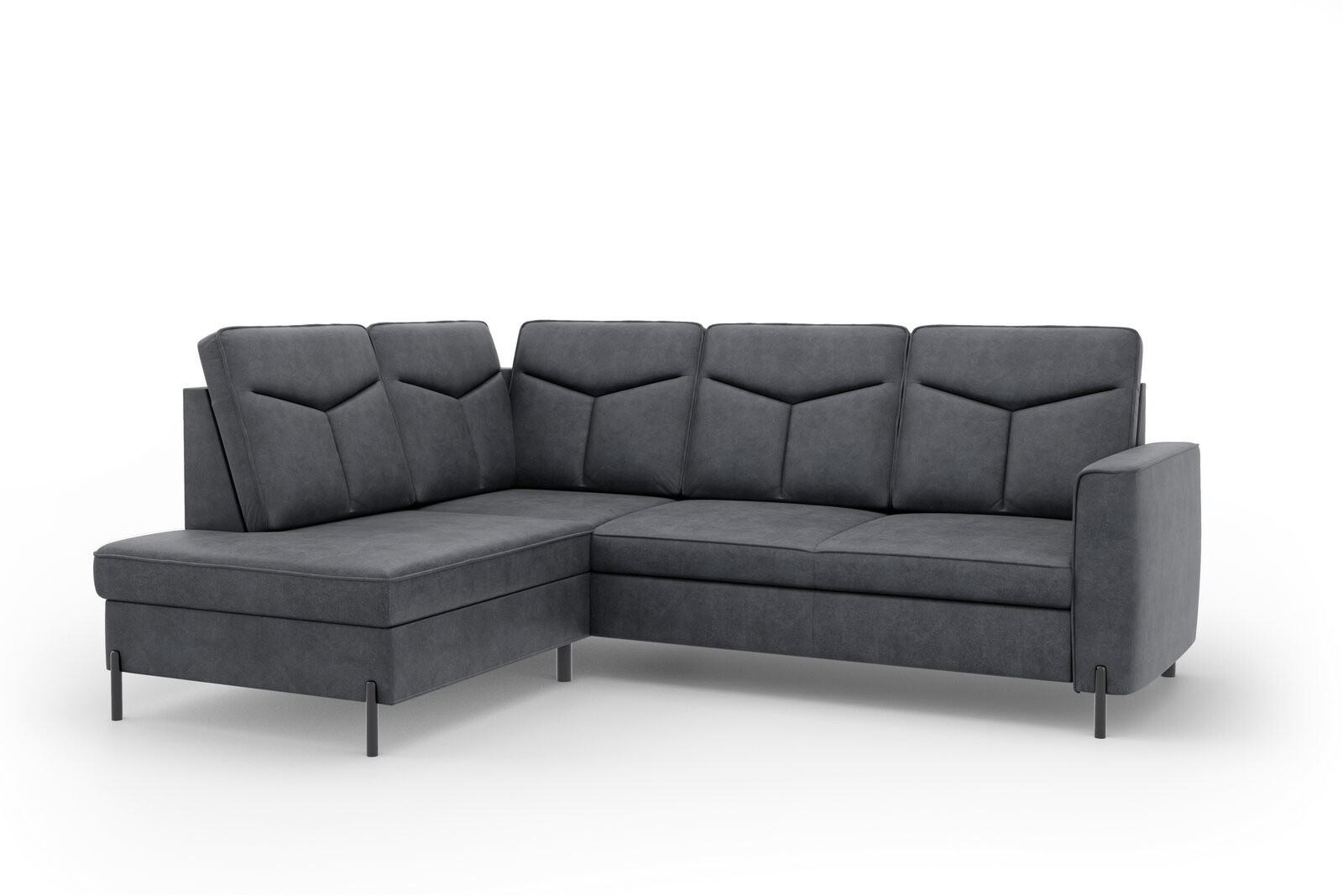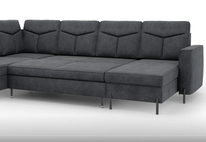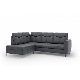 Moderní rohová sedací souprava GOMERA- funkční a praktická. Sedací soupravu lze rozložit kvalitní lůžko pro příležitostné přespání. Úložný prostor lze využít pro uložení dek a lůžkovin. Sedací soupravy je čalouněná kvalitní vysokoelastická HR pěnou umístěnou na vlnité pružině, která je zárukou trvanlivosti a vysokého komfortu sezení. Sedací souprava je postavena na černých ocelových nohách o výšce 10 cm. Rohová sedací souprava se vyrábí v pravém i levém provedení. Záda jsou čalouněná, je tedy vhodná i pro umístění v prostoru. K sedačce lze dokoupit taburet.