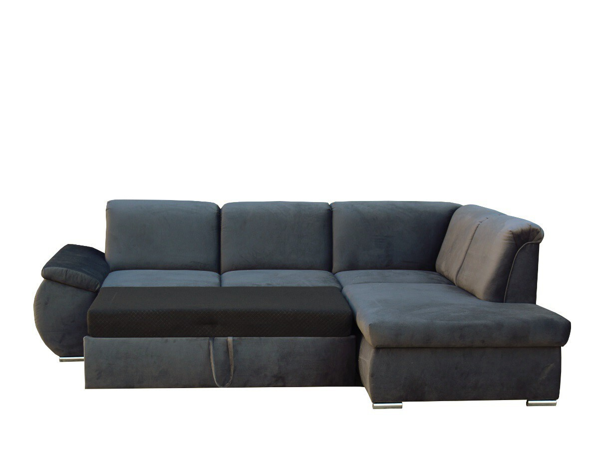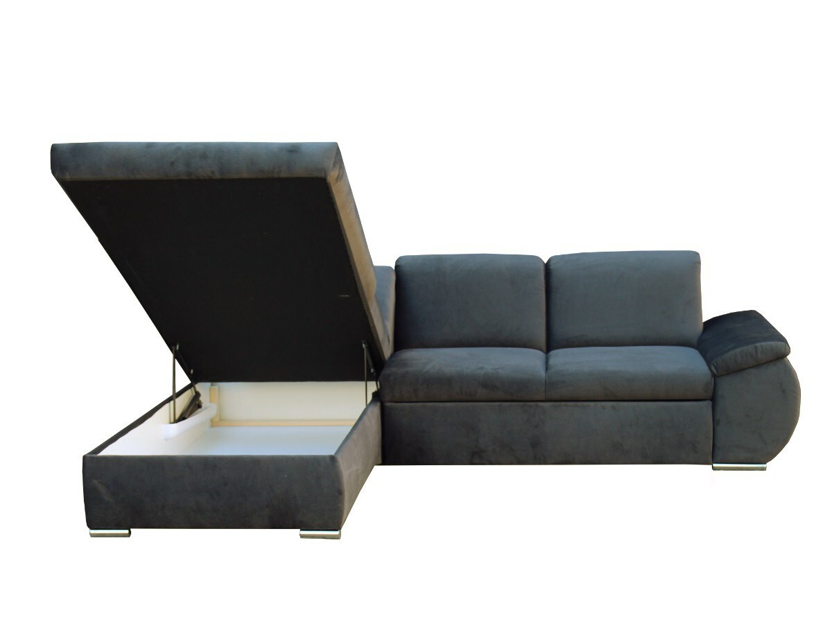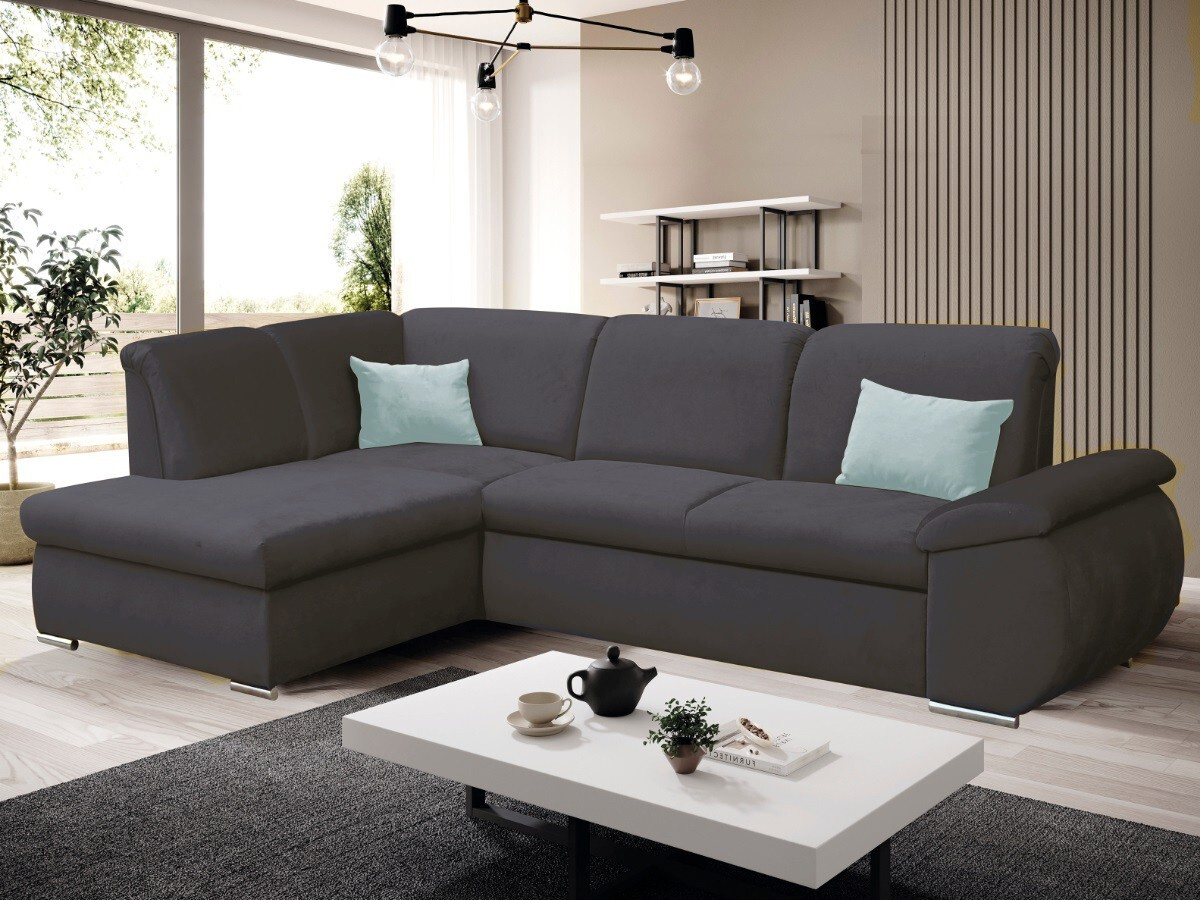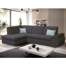 Moderní sedací souprava LEJLA, rozkládací pro příležitostné přespání, úložný prostor. Po rozložení plocha pro spaní 202 x 128 cm. Pohodlí při sezení zajišťuje výplň sedáku, tvořená kombinací vlnité pružiny s polyuretanovou pěnou, vysoce elastickou hmotou. Matrace rozkladu je pružinová. Nožky jsou kovové, pochromované. Sedačka je čalouněná i zezadu a dá se umístit do prostoru. Kvalitní zpracování a odolný materiál zajistí dlouhodobé využití rohové sedací soupravy. Součástí sedačky jsou dva ozdobné polštářky. Možnost objednání levého nebo pravého provedení.