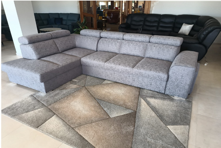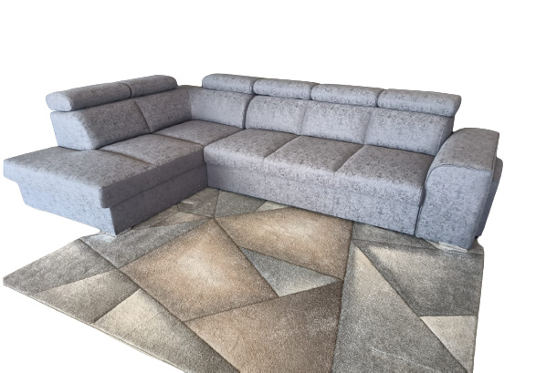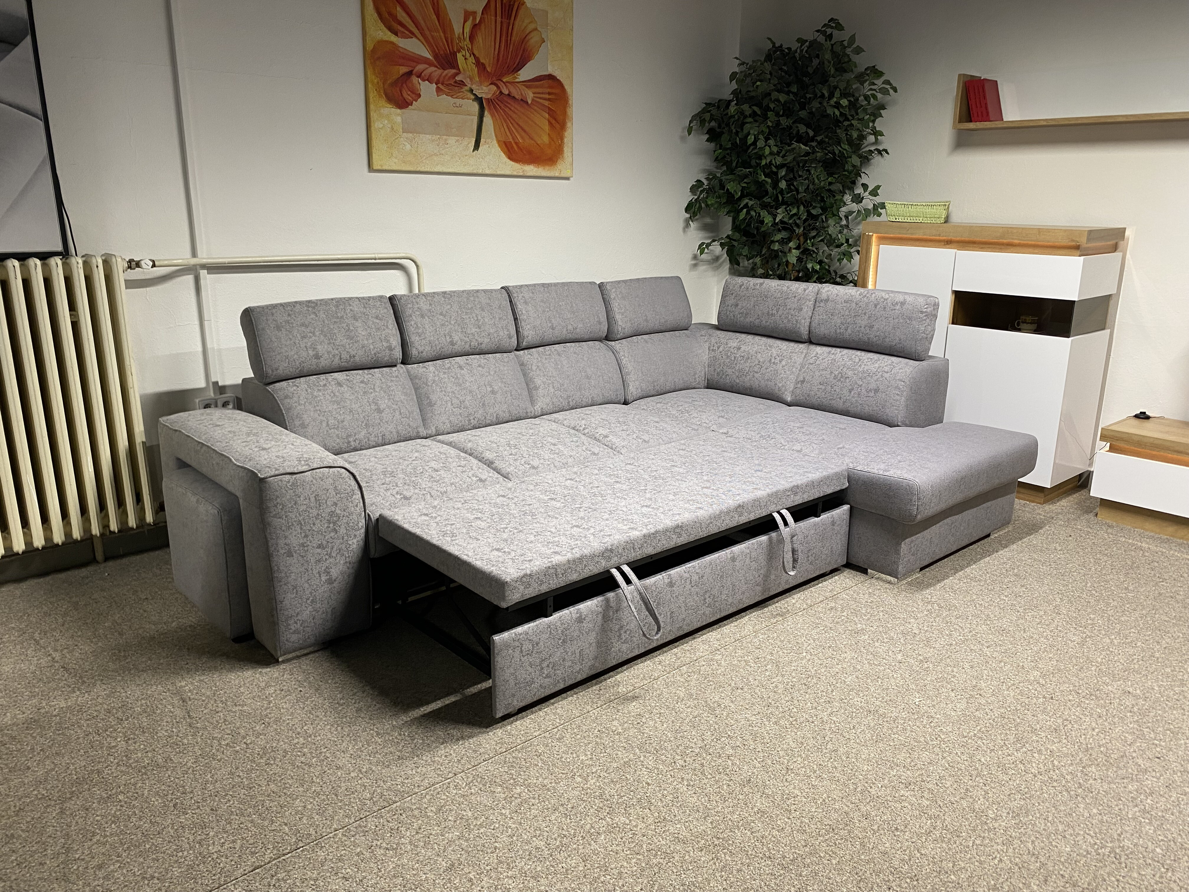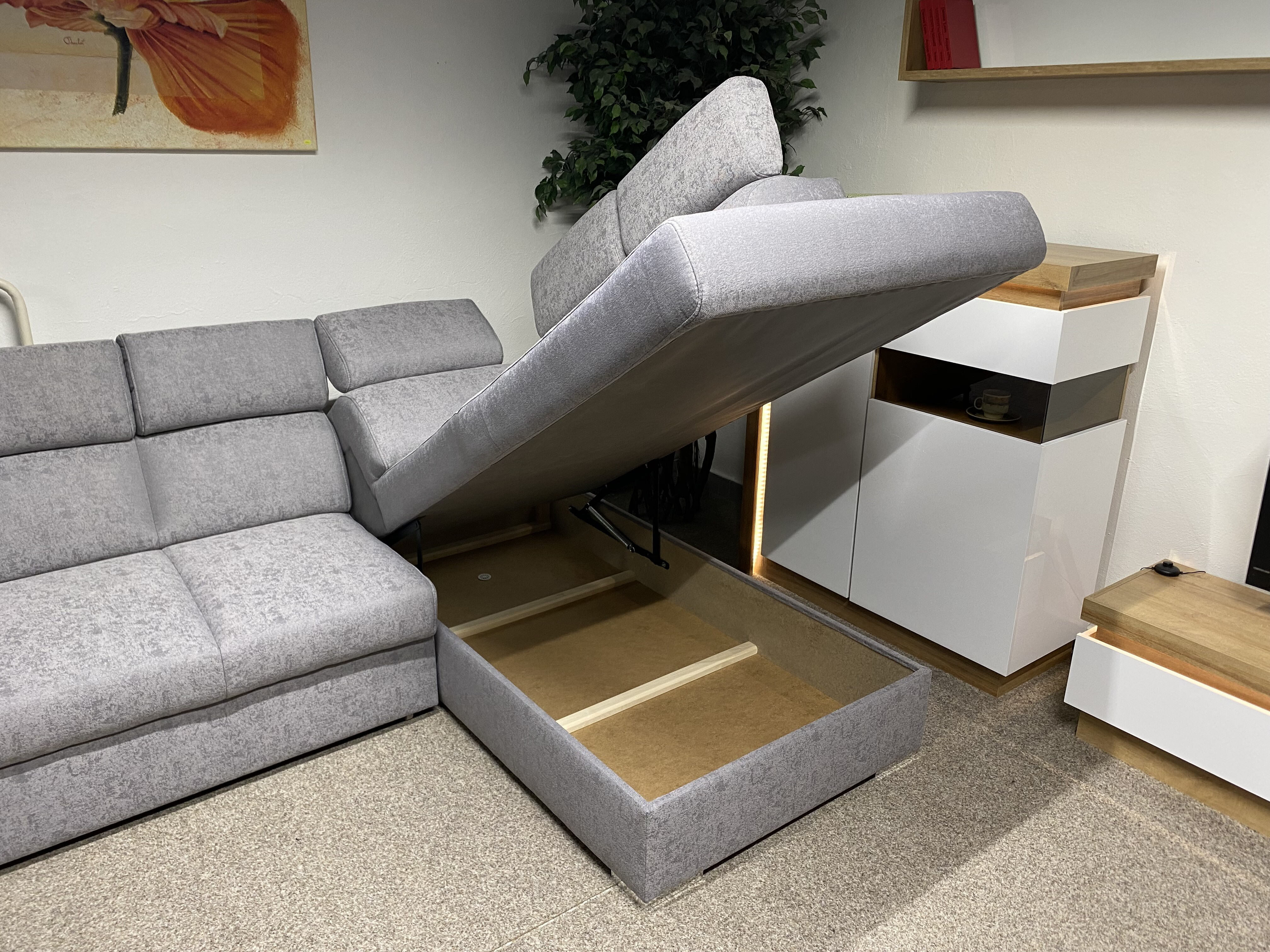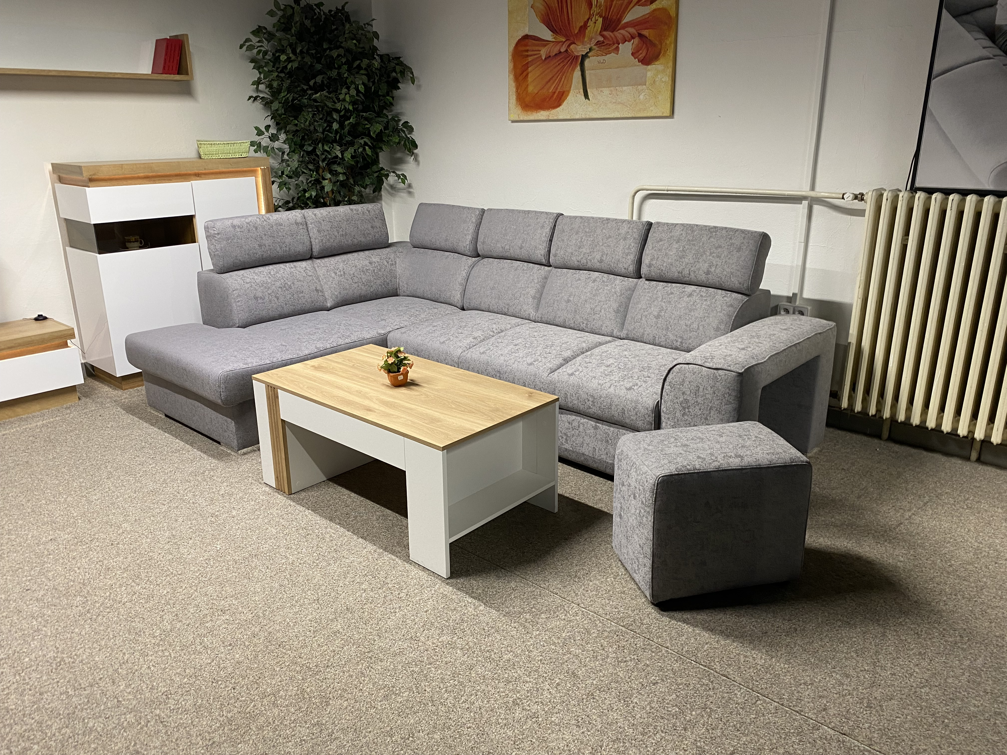 Rohová sedací souprava MADERA s výškově stavitelnými podhlavníky a taburetem uloženým v područce sedací soupravy. Sedačka je rozkládací s úložným prostorem. Po rozkladu vznikne plocha pro příležitostné spaní o rozměrech 120 x 200 cm. Na výběr máte pravou nebo levou variantu rohu. Sedací souprava je očalouněna šedou látkou Gusto 82, včetně zad sedačky, můžete ji umístit do prostoru. Pohodlí při sezení podpoří polohovatelné opěrky hlavy. Výška sedačky je podle sklopení opěrek hlavy 85 až 100 cm. Sedák je vyplněný kvalitní studenou HR pěnou položenou na vlnité pružině FALISTE - zaručuje komfortní posezení. Konstrukce je vyrobená z masívního dřeva. Možno zvlášť doobjednat i taburet (š. 90 cm, v. 44 cm, hl. 55 cm) ve stejné potahové látce, cena na dotaz u prodejce.