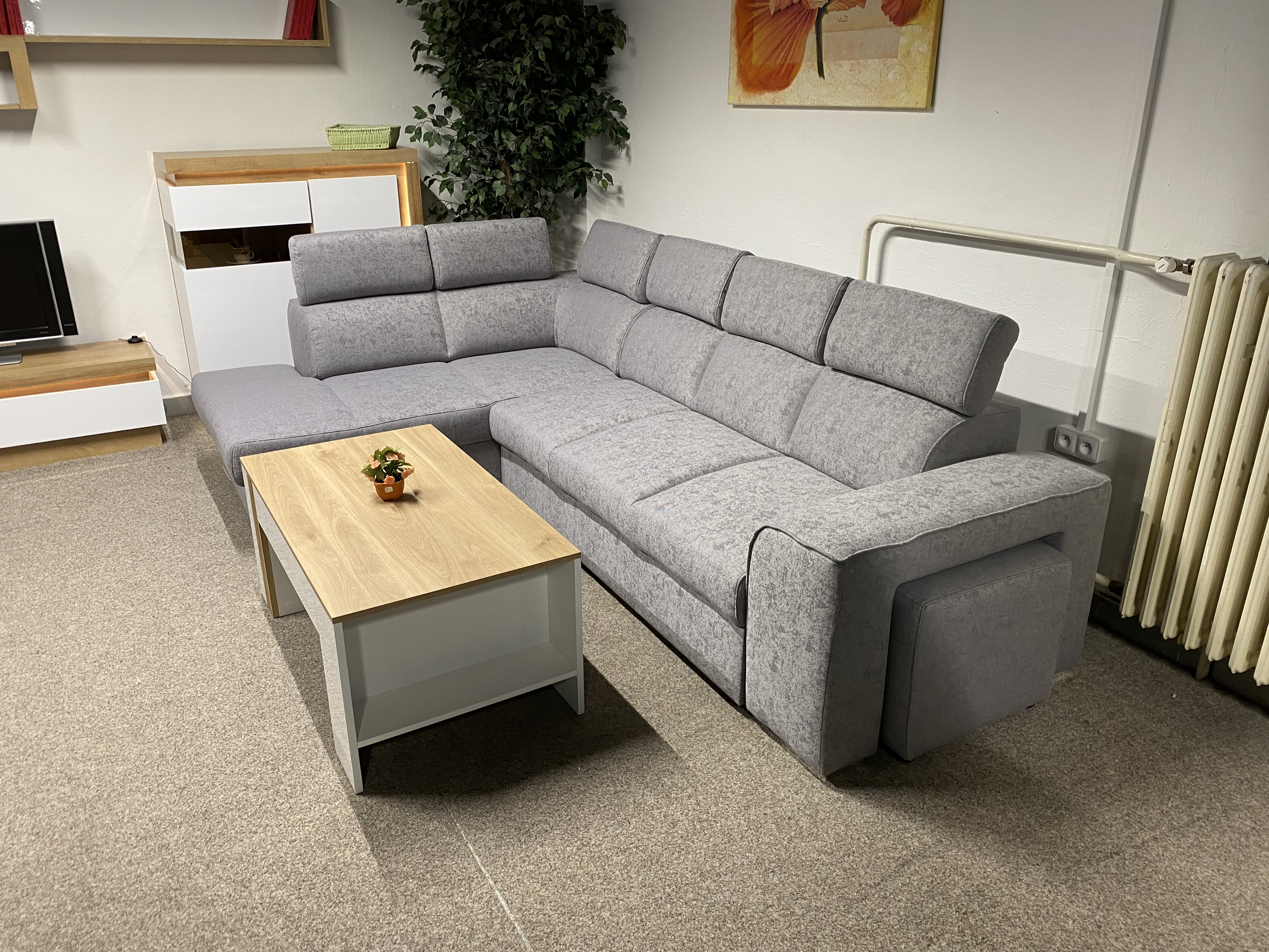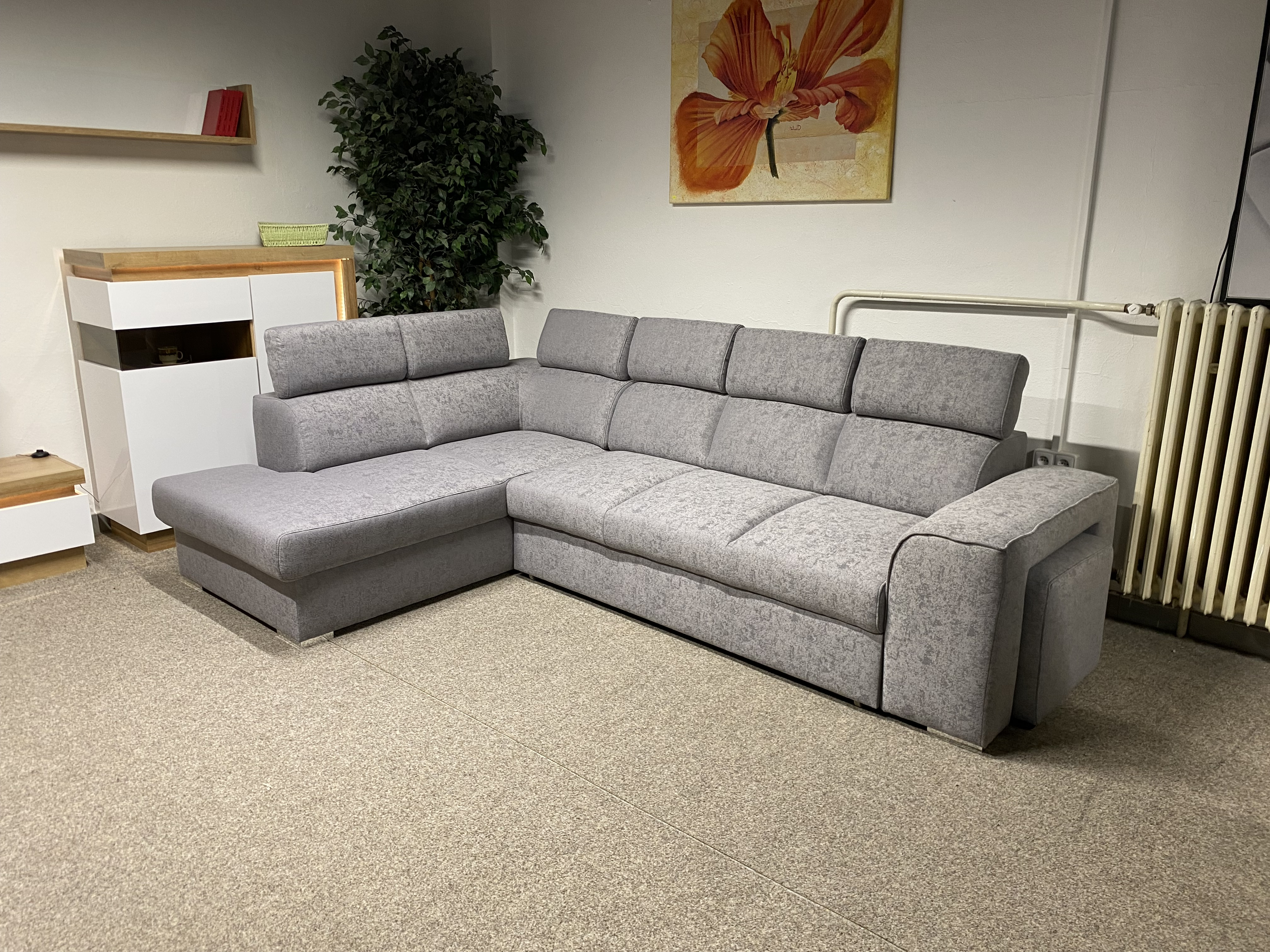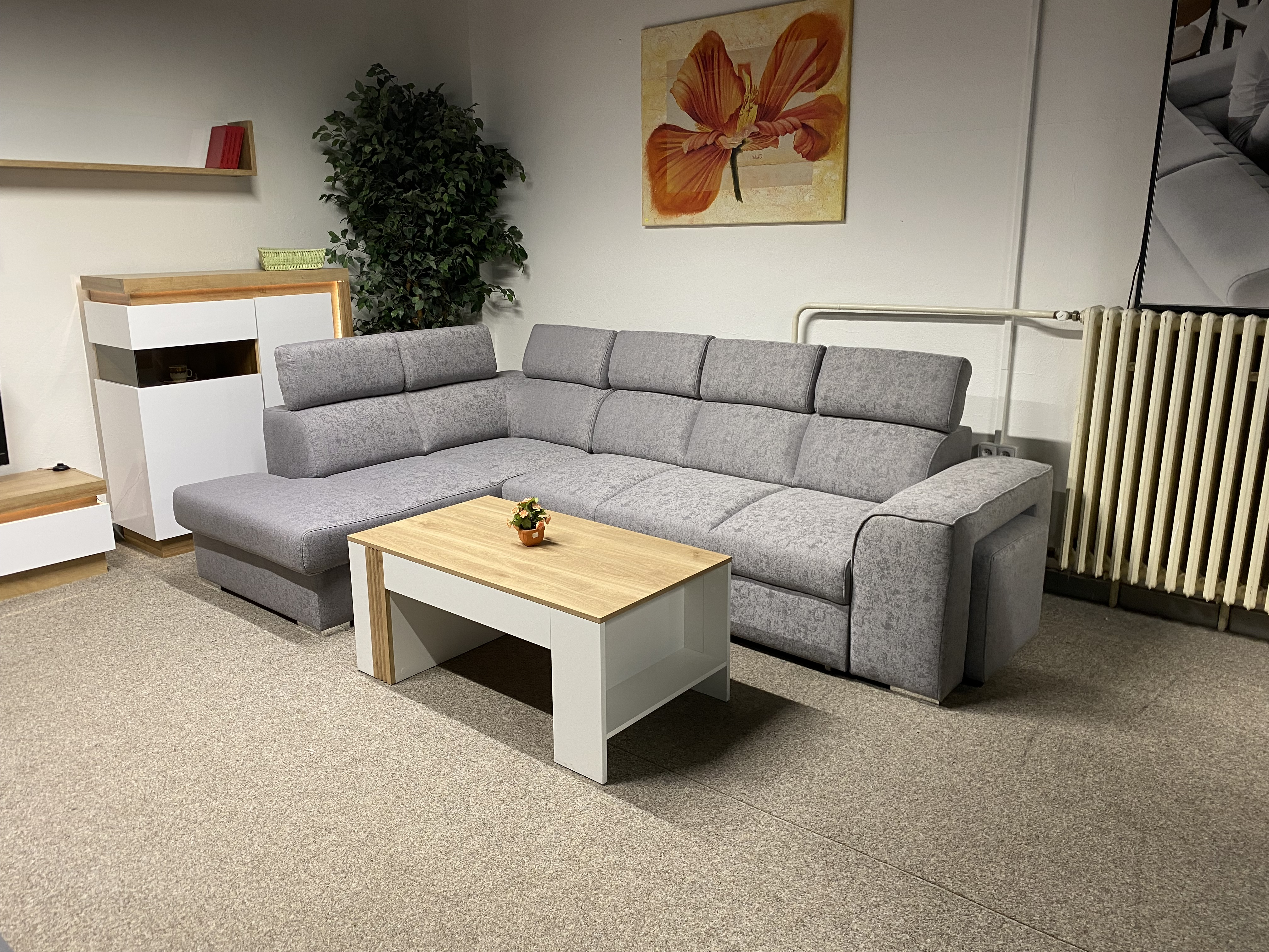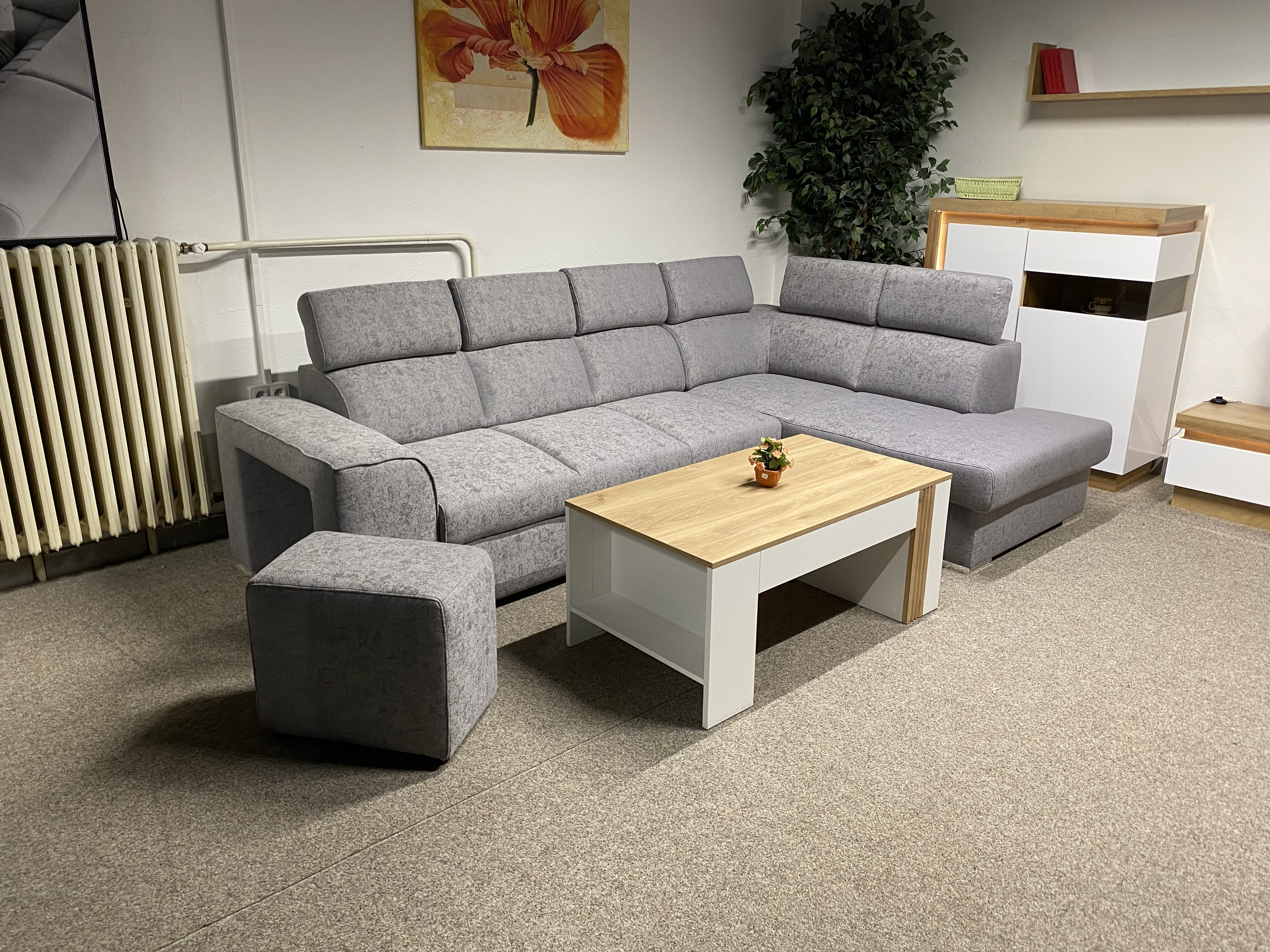 Rohová sedací souprava MADERA s výškově stavitelnými podhlavníky a taburetem uloženým v područce sedací soupravy. Sedačka je rozkládací s úložným prostorem. Po rozkladu vznikne plocha pro příležitostné spaní o rozměrech 120 x 200 cm. Na výběr máte pravou nebo levou variantu rohu. Sedací souprava je očalouněna šedou látkou Gusto 88, včetně zad sedačky, můžete ji umístit do prostoru. Pohodlí při sezení podpoří polohovatelné opěrky hlavy. Výška sedačky je podle sklopení opěrek hlavy 85 až 100 cm. Sedák je vyplněný kvalitní studenou HR pěnou položenou na vlnité pružině FALISTE - zaručuje komfortní posezení. Konstrukce je vyrobená z masívního dřeva. Možno zvlášť doobjednat i taburet (š. 90 cm, v. 44 cm, hl. 55 cm) ve stejné potahové látce, cena na dotaz u prodejce.