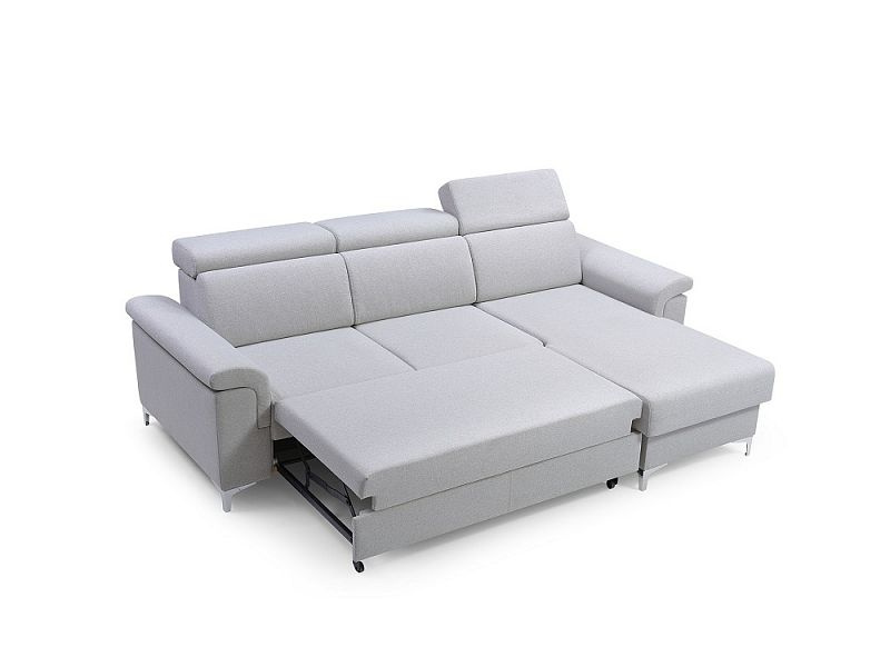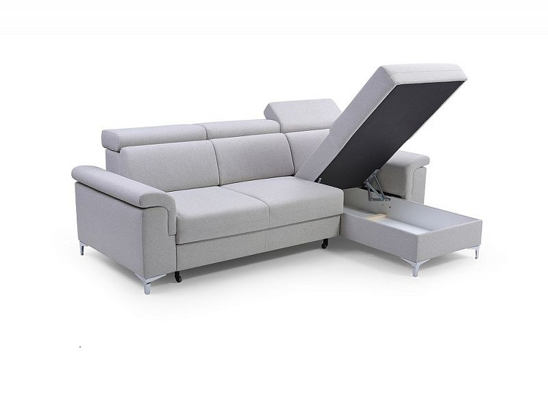 Moderní a pohodlná rohová sedací souprava. Sedačka je rozkládací s lůžkem pro příležitostné přespání, úložným prostorem pro lůžkoviny nebo deky. U rohovky je kladen důraz na pohodlí sezení polohovatelnými záhlavníky. Pohodlné sezení zaručuje kvalitní PUR pěna spolu s pružinovými vlnovci. Sedací souprava je očalouněná šedou potahovou látkou Cover 87.