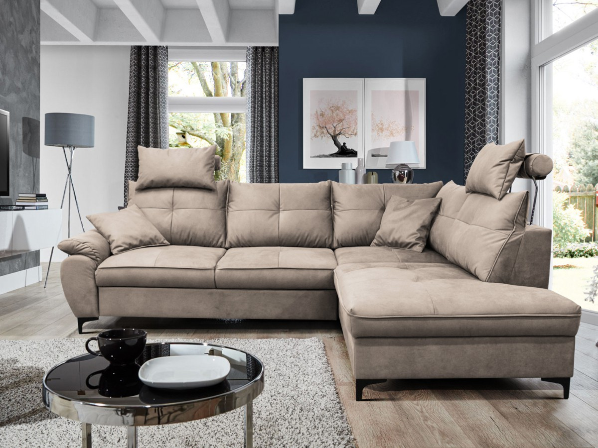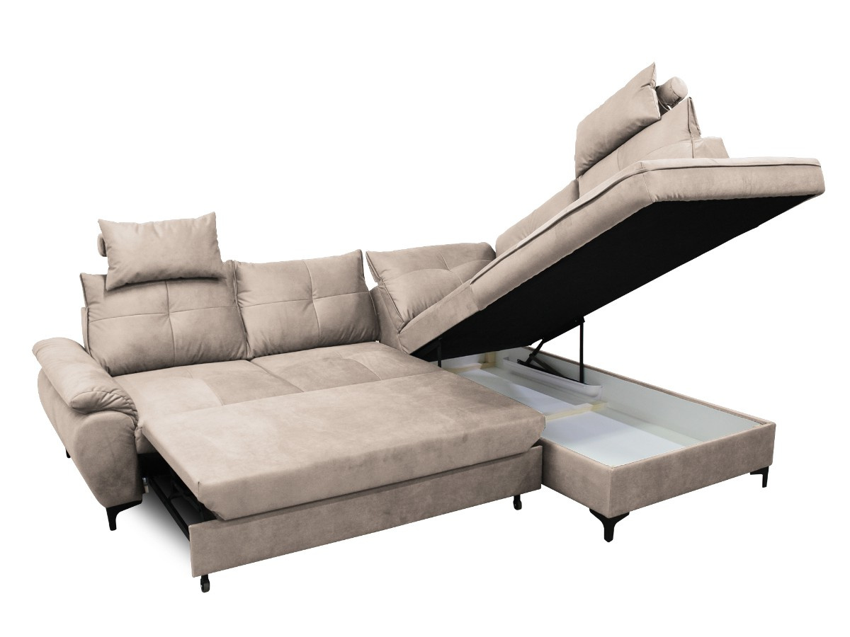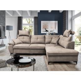 Luxusní rohová sedací souprava SAMANTA s úložným prostorem, rozkládací. Sedací souprava disponuje praktickým úložným prostorem. Soupravu dodáváme v levém nebo pravém provedení. Dva záhlavníky je možno umístit do kterékoliv z 5 pozic na sedačce. Možnost dokoupení záhlavníků. Výplň sedáků sedací soupravy tvoří kvalitní HR pěna. Moderní souprava je vyplněna pružinami Faliste. Pohodlná rozkládací sedací souprava je určena pro občasné spaní. Soupravu rozložíte vysunutím šuplíku.