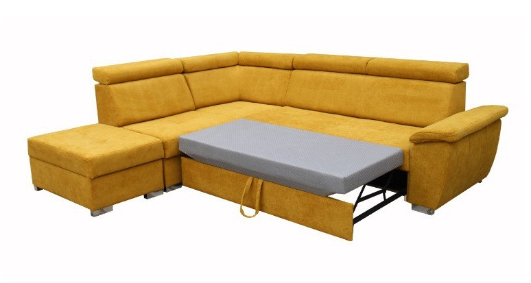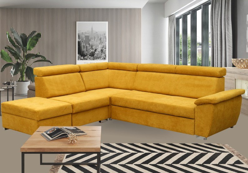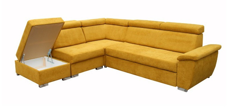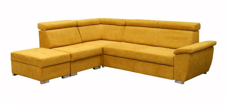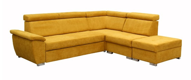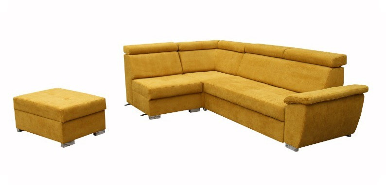 Pohodlná a moderní rohová sedací souprava URSULA MAX. Sedačka je rozkládací s úložným prostorem. Výplň opěrných polštářů je PUR pěna, sedák je vyplněn vlnitou pružinou a PUR pěnou. Po rozložení vznikne spací plocha o rozměrech 125 x 202, je vhodná na příležitostné spaní. V barevném provedení Alfa 120 - hořčicová, viz foto. Sedačka je v pravém nebo levém rohovém provedení. Opěrky hlavy jsou stavitelné. Taburet můžete použít i samostatně v prostoru.