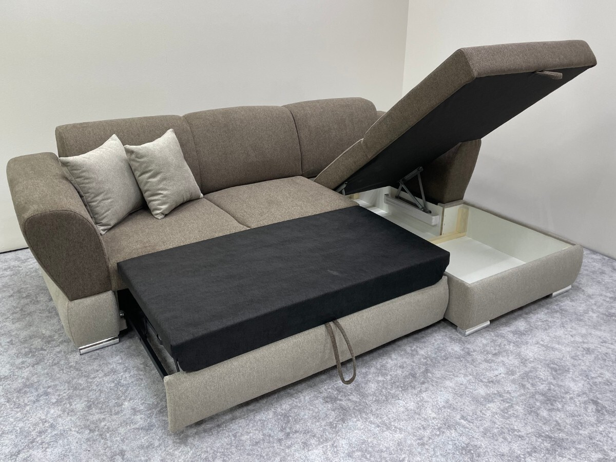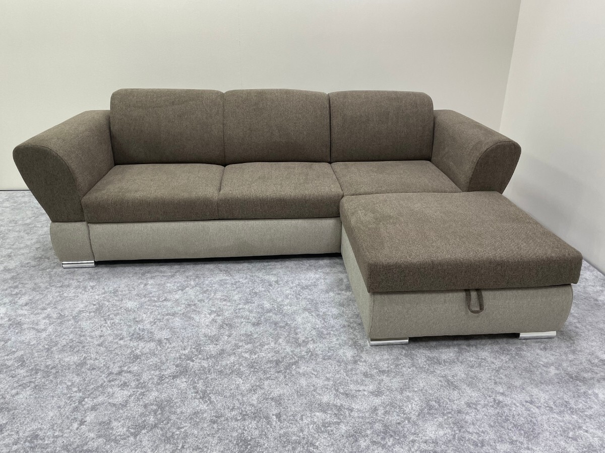 Moderní rohová sedací souprava - VIVI. V barevném provedení Montana 19/17 - hnědá / béžová. Sedačka je rozkládací s úložným prostorem. Výplň opěrných polštářů je PUR pěna, sedák je vyplněn vlnitou pružinou a PUR pěnou. Po rozložení vznikne spací plocha o rozměrech 130 x 200, je vhodná na příležitostné spaní.