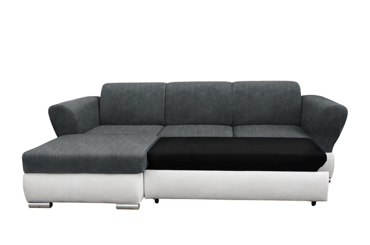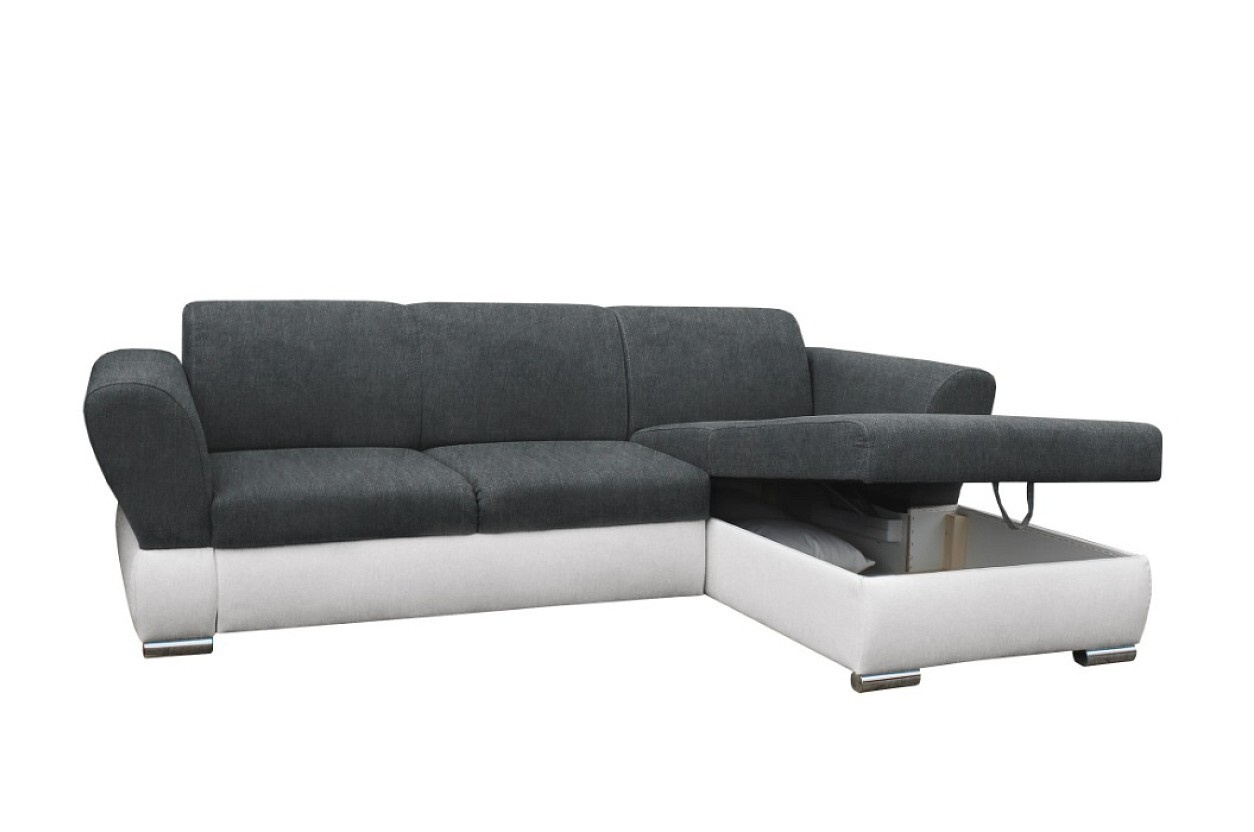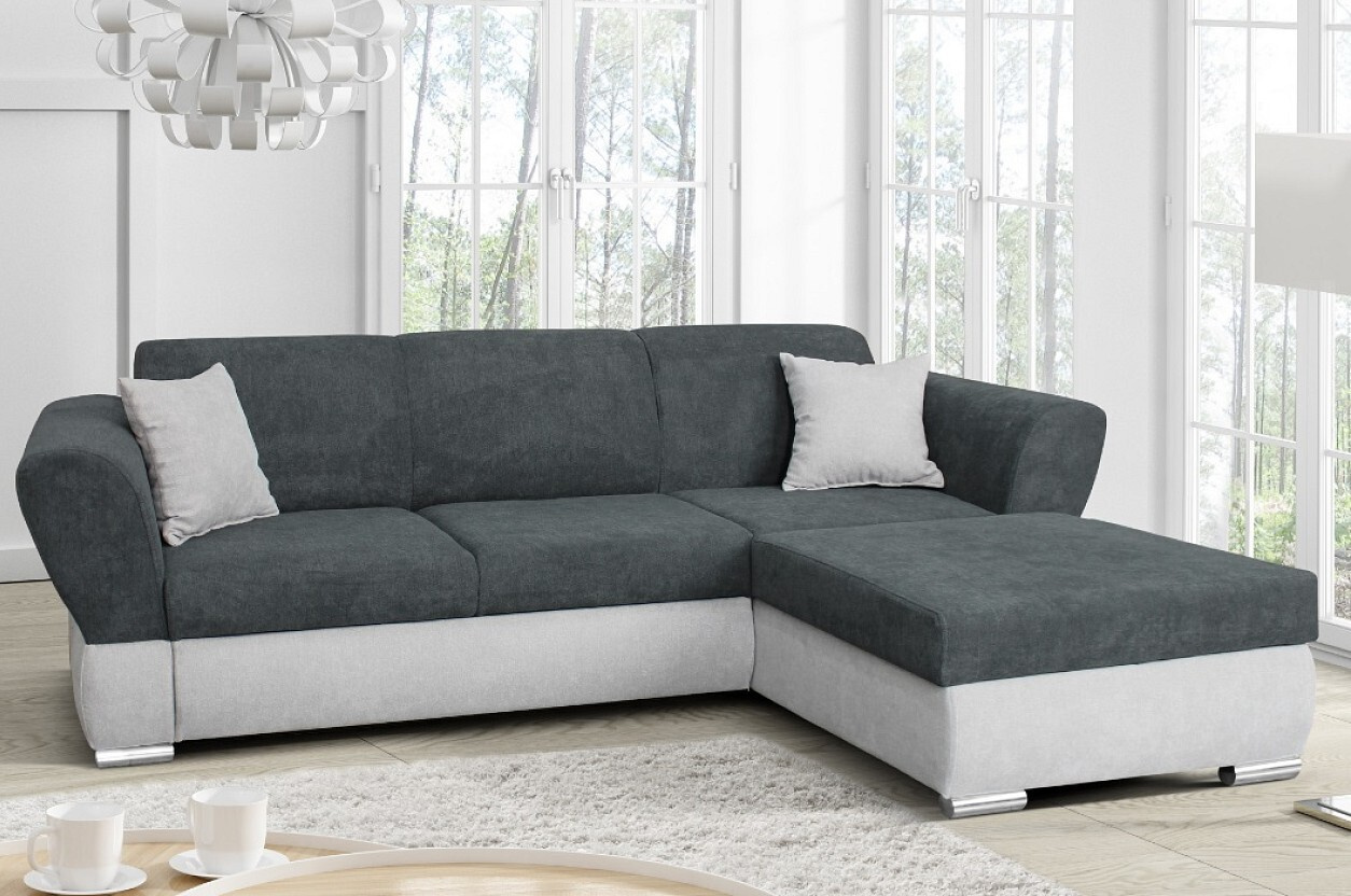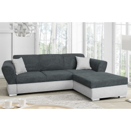 Moderní rohová sedací souprava - VIVI. V barevném provedení Montana 05/01 - tmavě šedá / světle šedá. Sedačka je rozkládací s úložným prostorem. Výplň opěrných polštářů je PUR pěna, sedák je vyplněn vlnitou pružinou a PUR pěnou. Po rozložení vznikne spací plocha o rozměrech 130 x 200, je vhodná na příležitostné spaní.