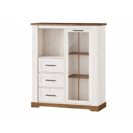 Vitrína ze systému ROVA - jedna polovina policová, prosklená, kterou můžete za příplatek doplnit LED osvětlením. Polovina druhá šuplíky a otevřená odkládací nika