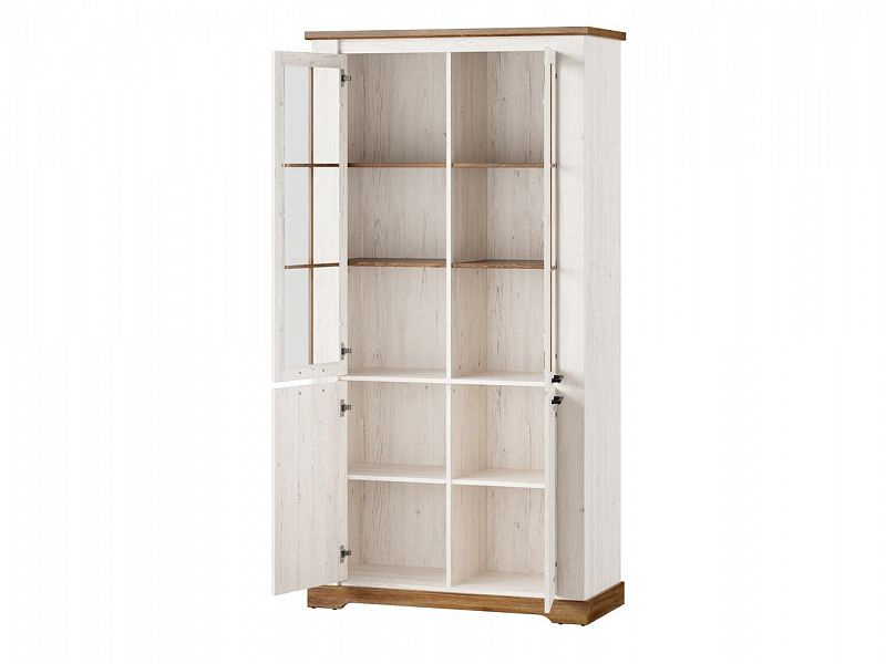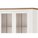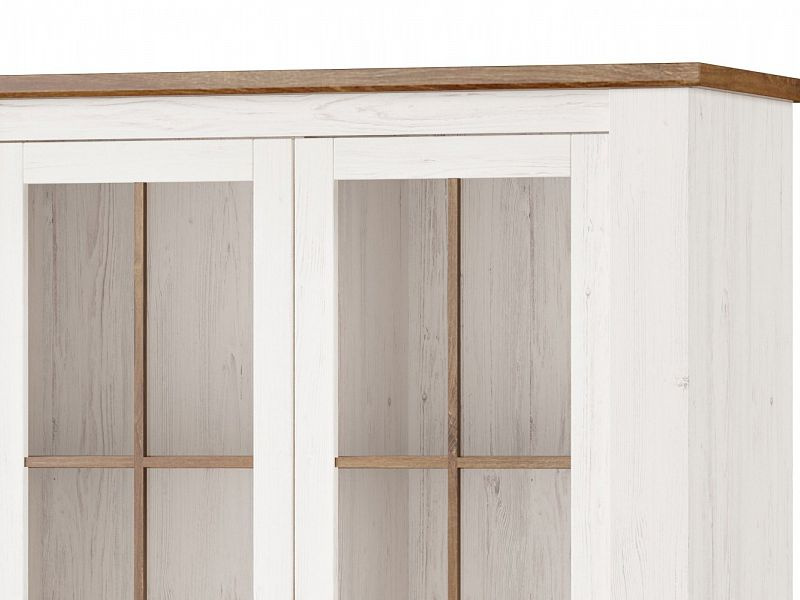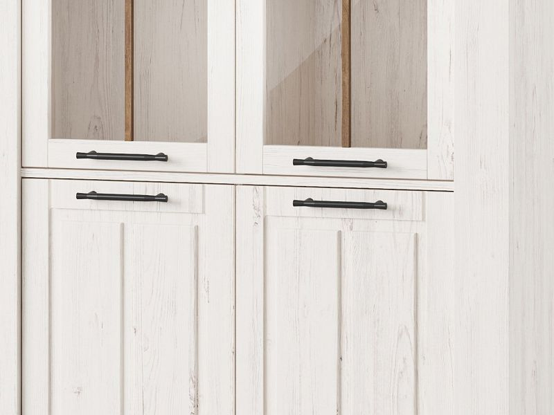 ROVEN je nadčasový a designově velmi povedený systémový nábytek. Bude slušet obývacímu pokoji i jídelně. Je vyroben z foliované dřevotřísky v barevném provedení bílá borovice andersen / dub stirling. U prosklených částí je použito tvrzené bezpečnostní sklo.